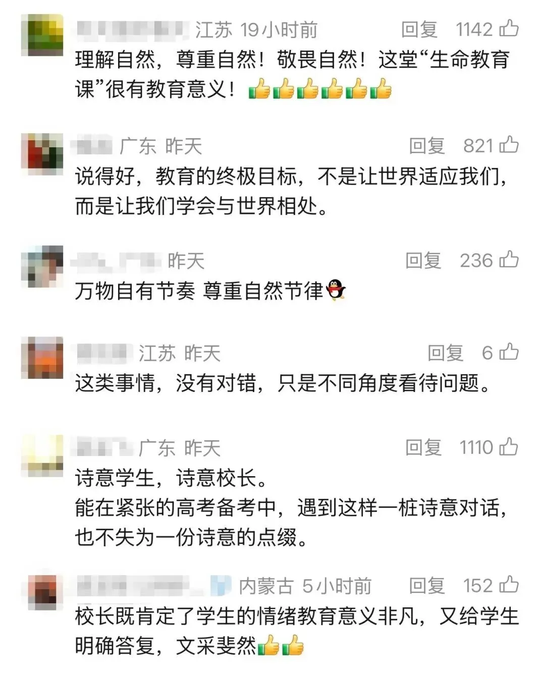 网友们纷纷为袁卫星校长的教育智慧点赞:“理解自然,尊重自然,敬畏自然!这堂‘生命教育课’很有教育意义”“说得好,教育的终极目标,不是让世界适应我们,而是让我们学会与世界相处”……