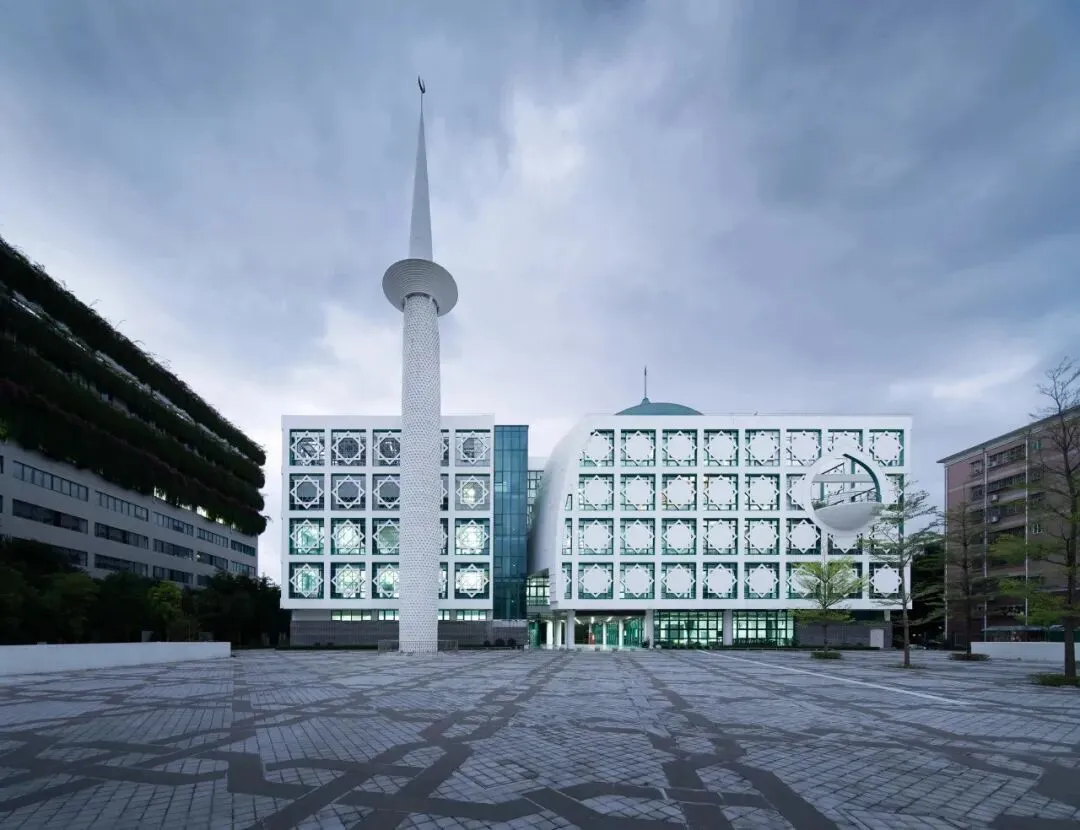 清真寺的建筑风格简约现代,设计精巧。整体建筑形似扬帆启航的宝船,广场上的光塔造型与广州光塔寺的千年光塔相呼应。这一设计融合了中国伊斯兰教传统文化与大湾区现代建筑科技,深刻展现了深圳作为海洋中心城市的精神特质,同时也代表了信教群众对“一带一路”倡议的期许。