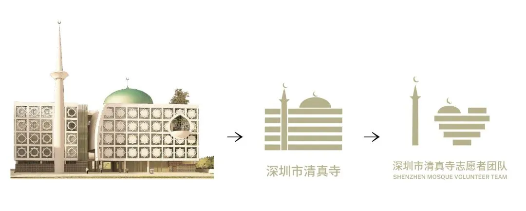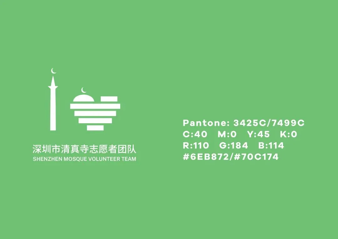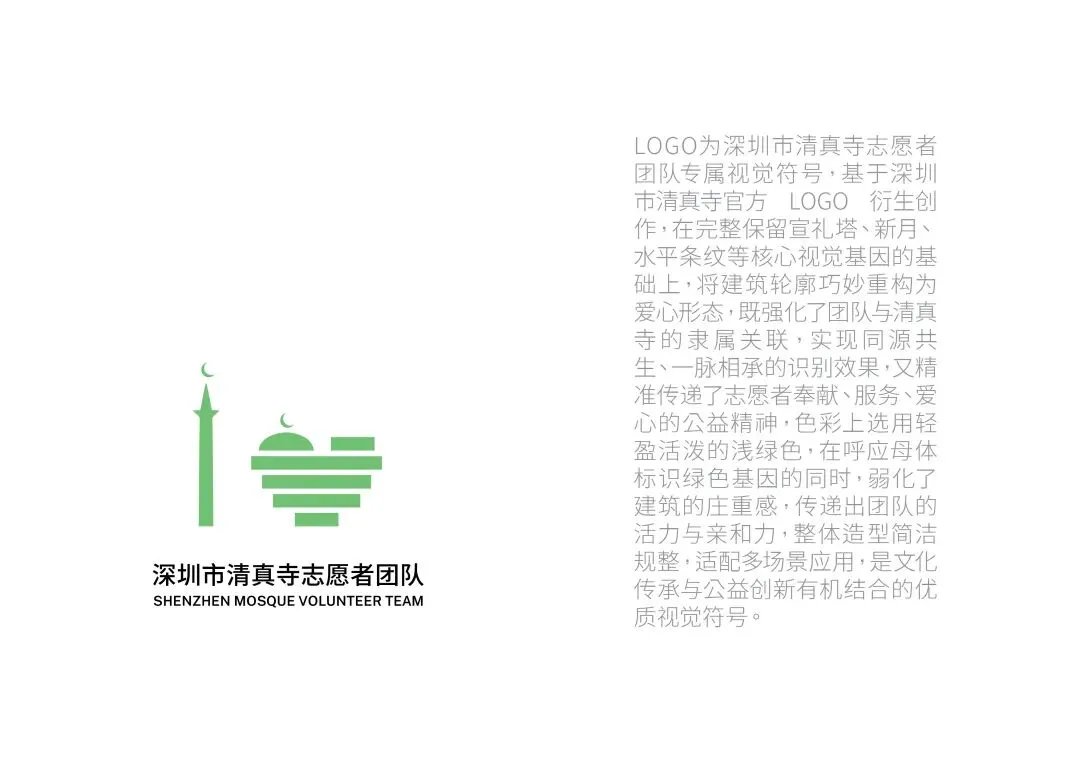 logo为深圳市清真寺志愿者团队专属视觉符号,基于深圳市清真寺官方 logo 衍生创作,在完整保留宣礼塔、新月、水平条纹等核心视觉基因的基础上,将建筑轮廓巧妙重构为爱心形态,强化了志愿者与清真寺的隶属关联,实现同源共生、一脉相承的识别效果,又精准传递了志愿者奉献、服务、爱心的公益精神,色彩上选用轻盈活泼的浅绿色,在呼应母体标识绿色基因的同时,弱化了建筑的庄重感,传递出志愿者的活力与亲和力,整体造型简洁规整,适配多场景应用,是文化传承与公益创新有机结合的优质视觉符号。