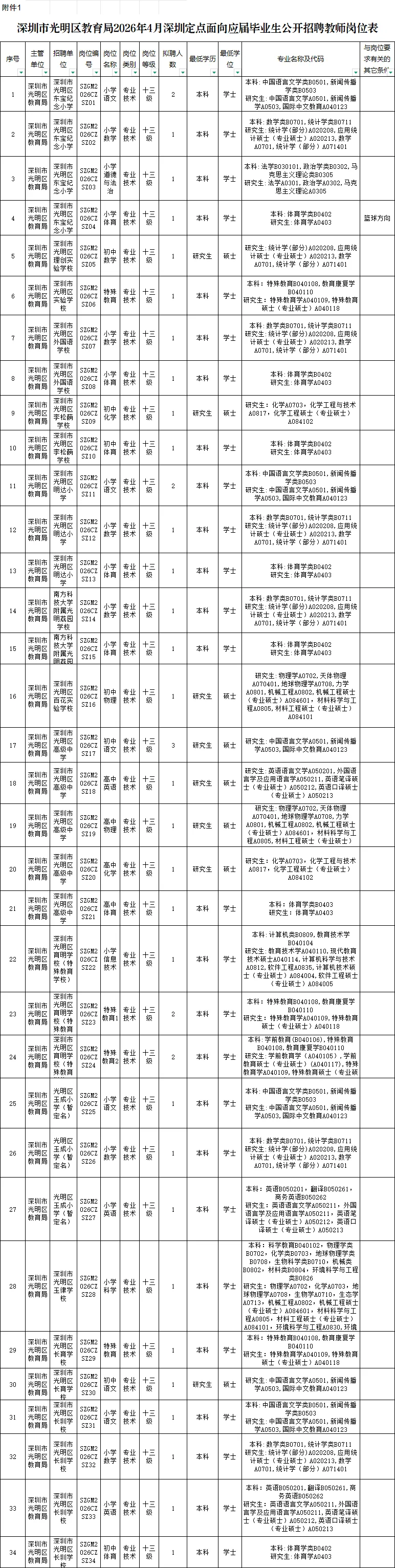 深圳市光明区教育局2026年4月深圳定点面向应届毕业生公开招聘教师40名,具体岗位见招聘岗位表(附件1)。现就有关事项公告如下: