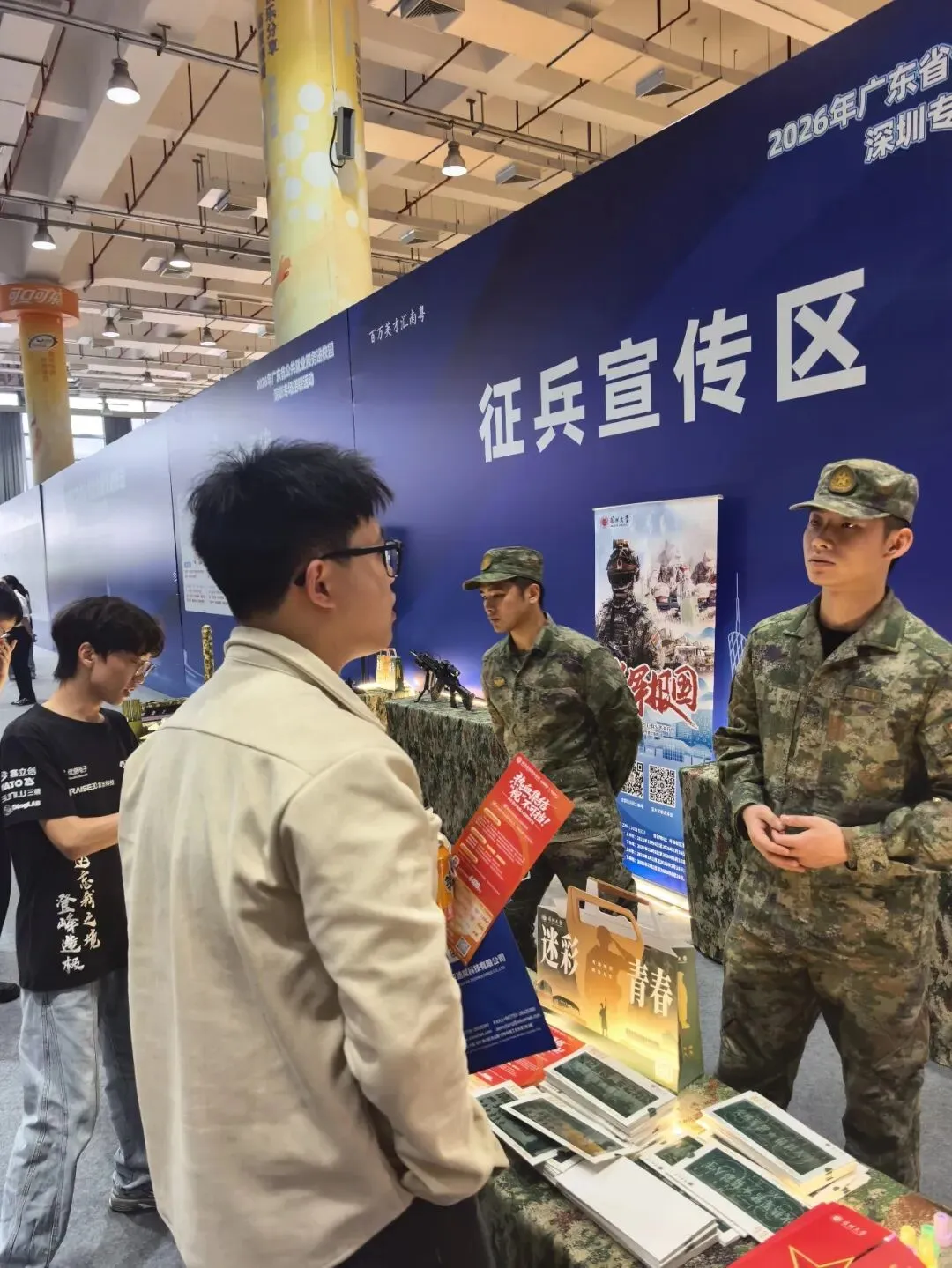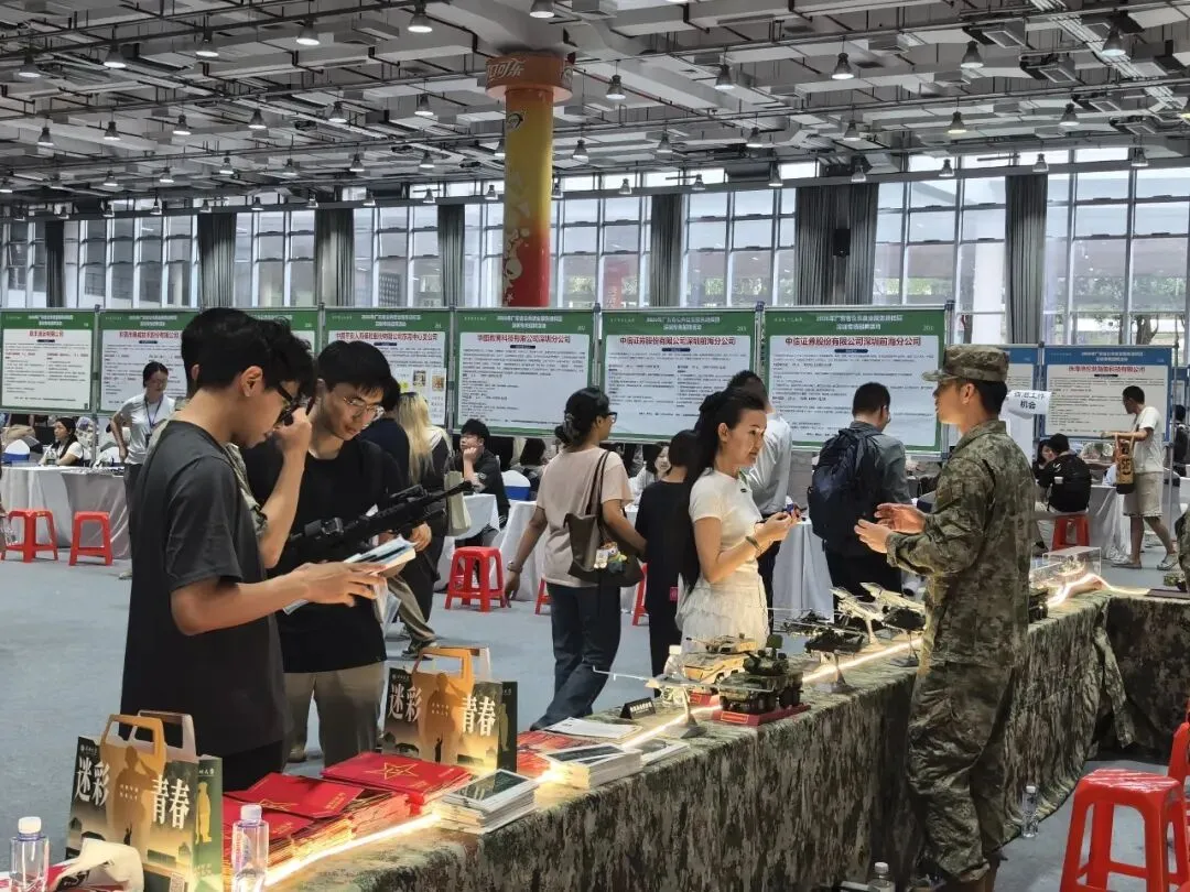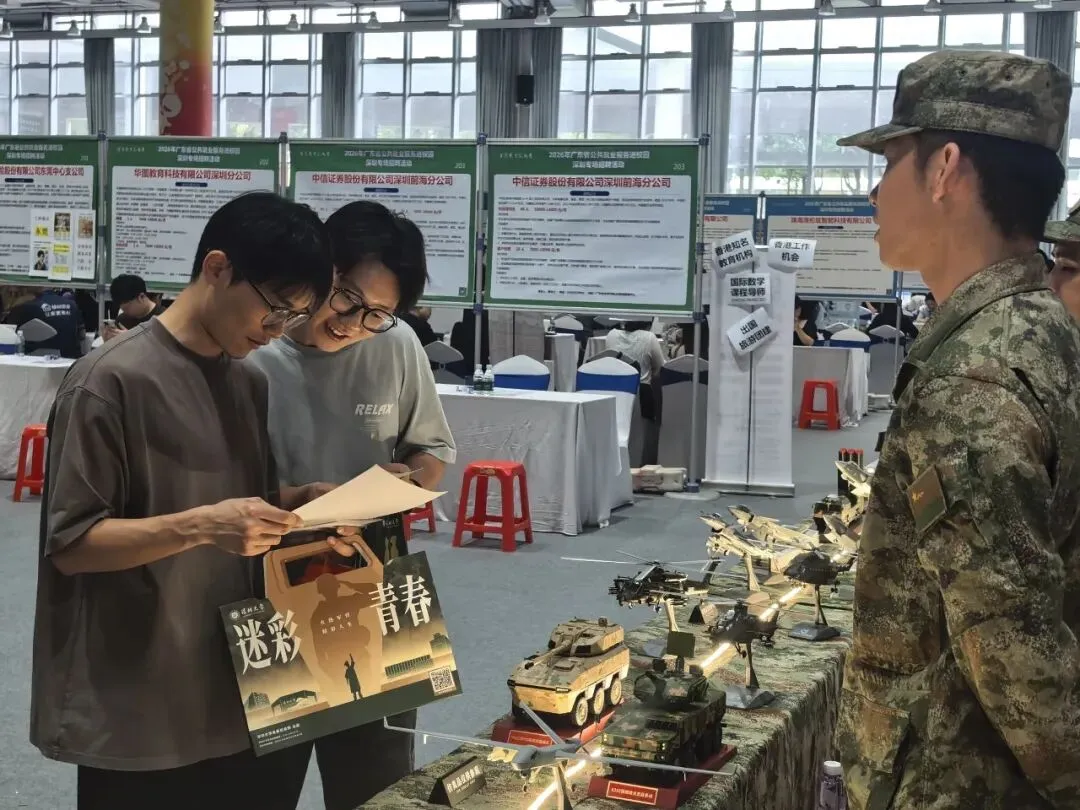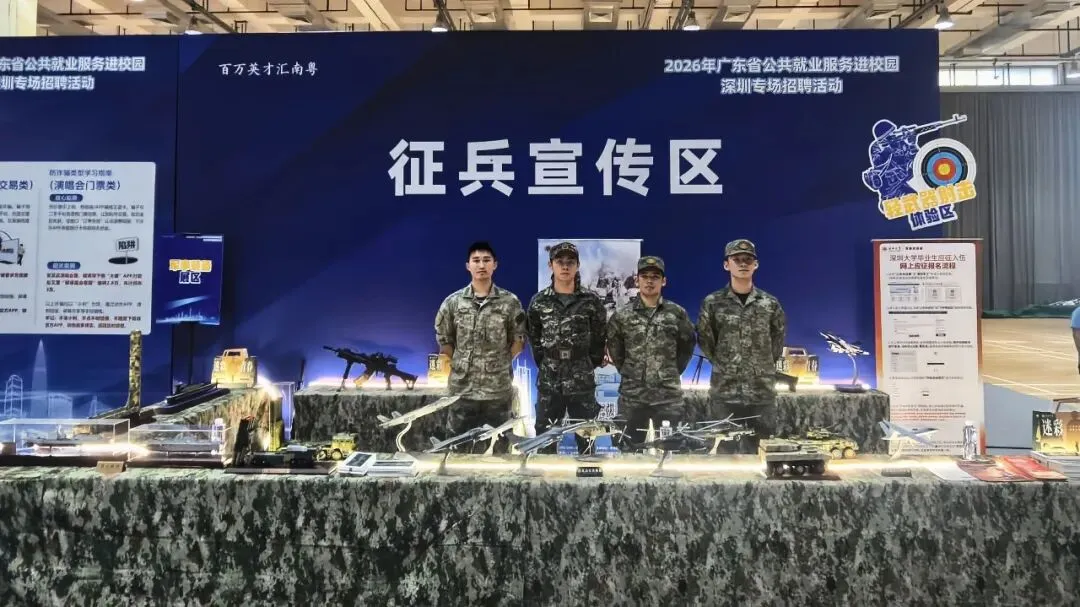 2026年3月28日下午,2026年广东省公共就业服务进校园深圳专场招聘活动在深圳大学粤海校区举办,200余家优质用人单位吸引了大量毕业生前来求职。在密集的企业展位中,一片由军事模型、迷彩元素构成的“征兵宣传区”格外醒目,成为招聘会上一道独特的风景。