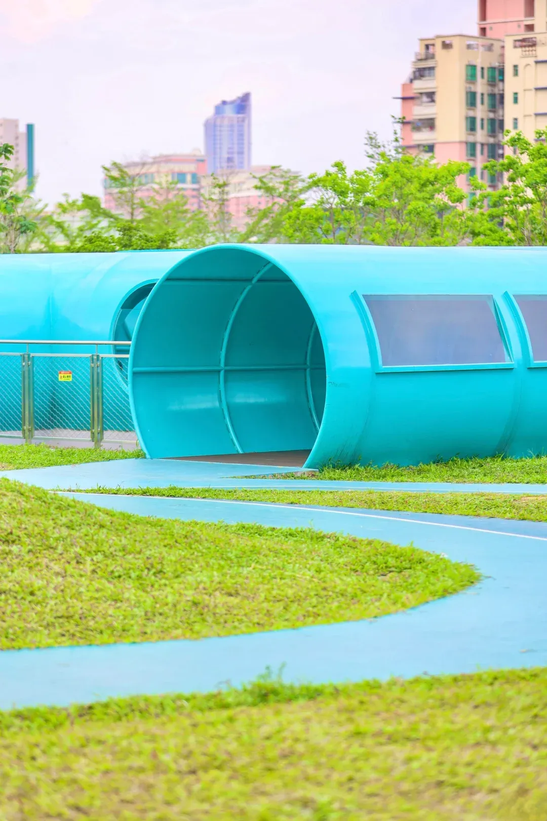 说实话,我们下午三点多到的,阳光正好打在蒂芙尼蓝的栏杆和地面上,整个场景像加了日系滤镜。沿着跑道慢走一圈,旁边花丛里蜜蜂忙得嗡嗡响,草坪上有几家人铺了垫子,小朋友光脚跑来跑去。我坐在长椅上发了20分钟呆,居然真的——心情莫名变好了。