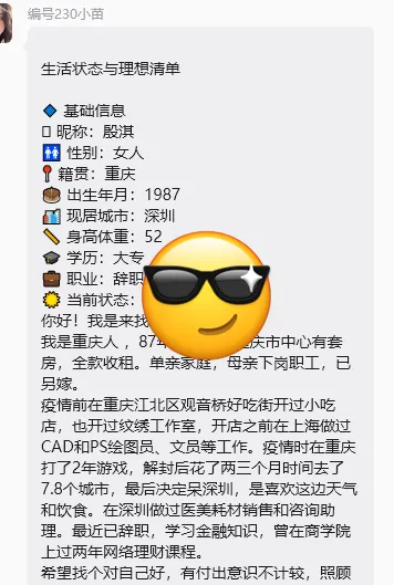 87年,重庆人,在重庆市中心拥有自有房产,每月享有稳定租金收益。成长于单亲家庭,母亲已重组家庭,目前生活安稳自在。