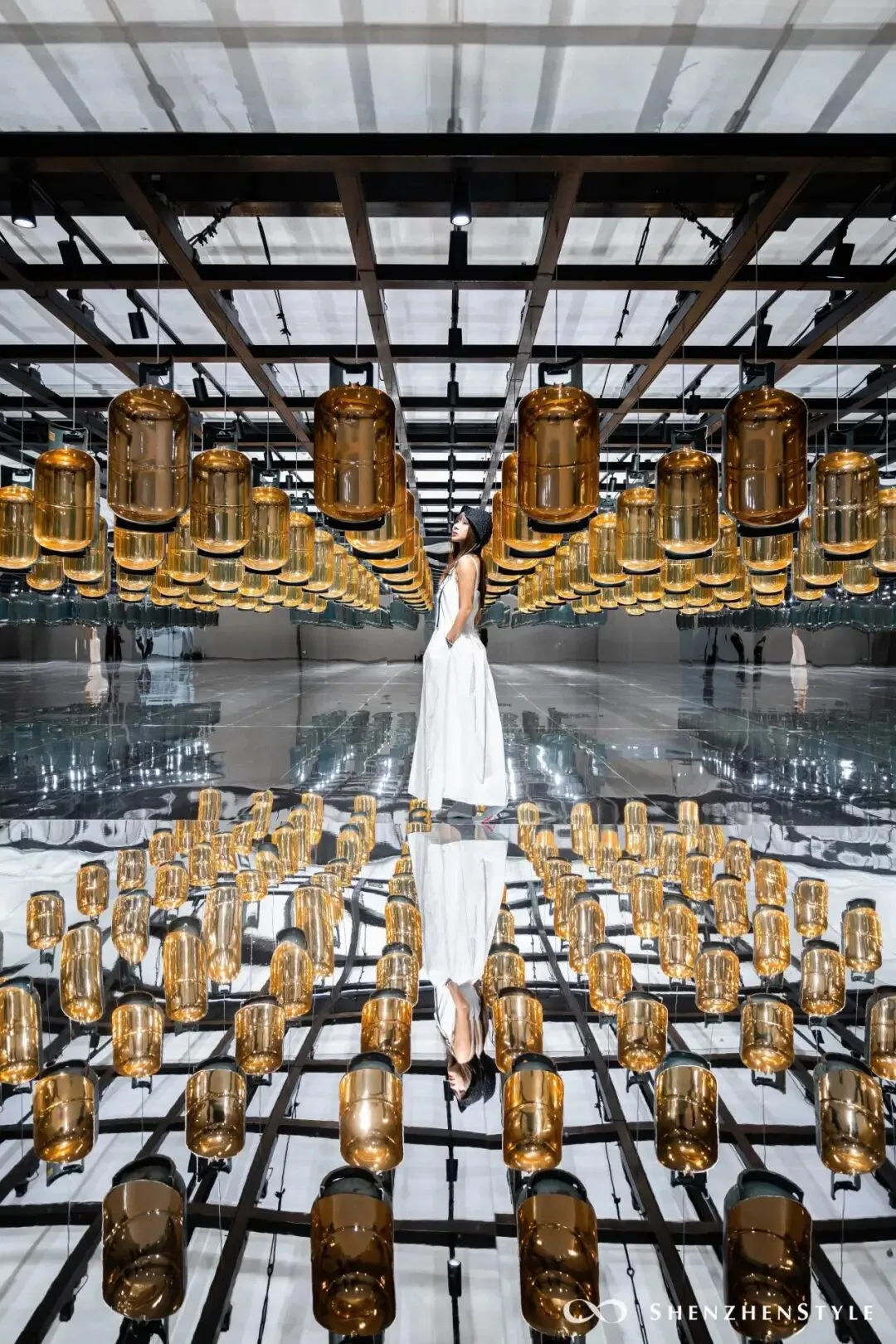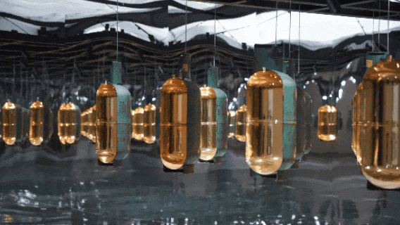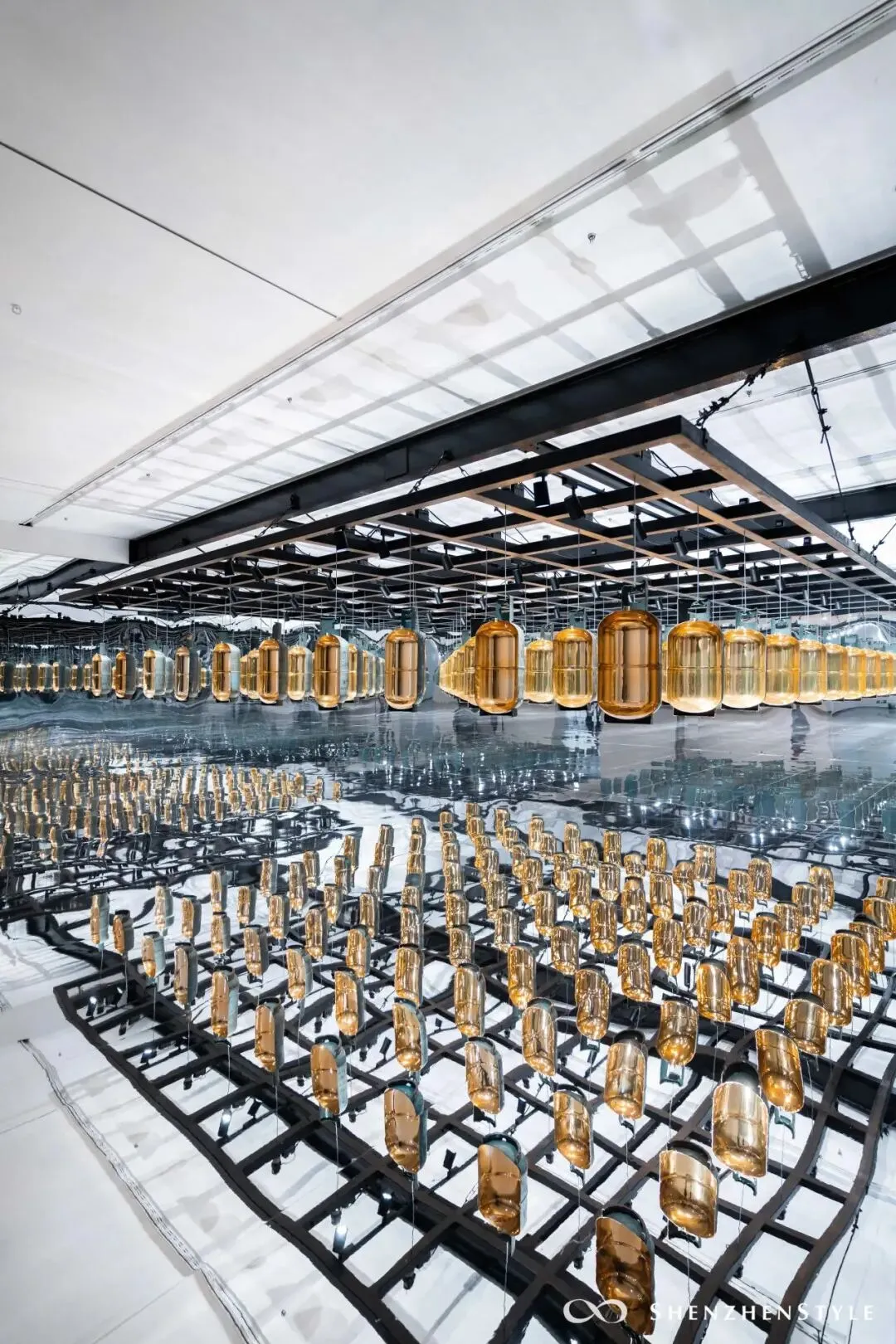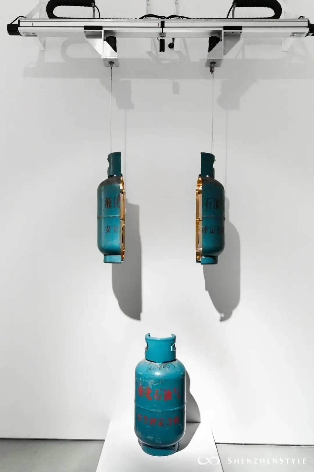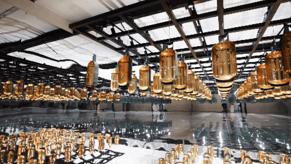 100 个被剖开并镀金的工业煤气瓶悬挂于此,在镜面的墙面与地板中倒映、旋转,像是走进了一个没有尽头的荒诞梦境,迷幻、失控;又如同工业废墟中生长出的荒诞纪念碑,直指技术与物质的关系悖论。
