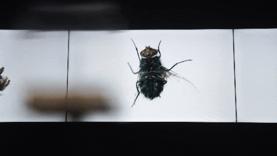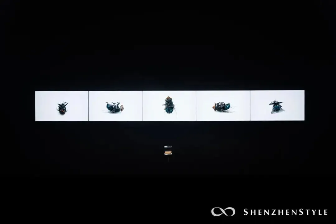 作品从五个不同角度拍摄一只濒死苍蝇生命的最后时刻,并以同步影像形式播放。