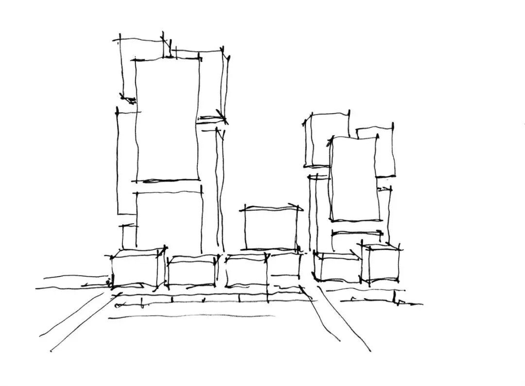 在建筑形态上,天音大厦的南北两座塔楼如同两棵参天大树,扎根于深圳湾这片充满活力的土地上。整体布局由两座主要高层塔楼(南北向)坐落于同一个景观平台上,通过裙房“盒子”灵活组合,化解场地宽度有限的制约,围合出尺度丰富的户外空间。错落有致的“悬浮立方体”造型,象征天音通信多元化的业务领域(如不同部门与产品线)。塔楼与裙房结合多变视角,形成聚落般的亲切感。