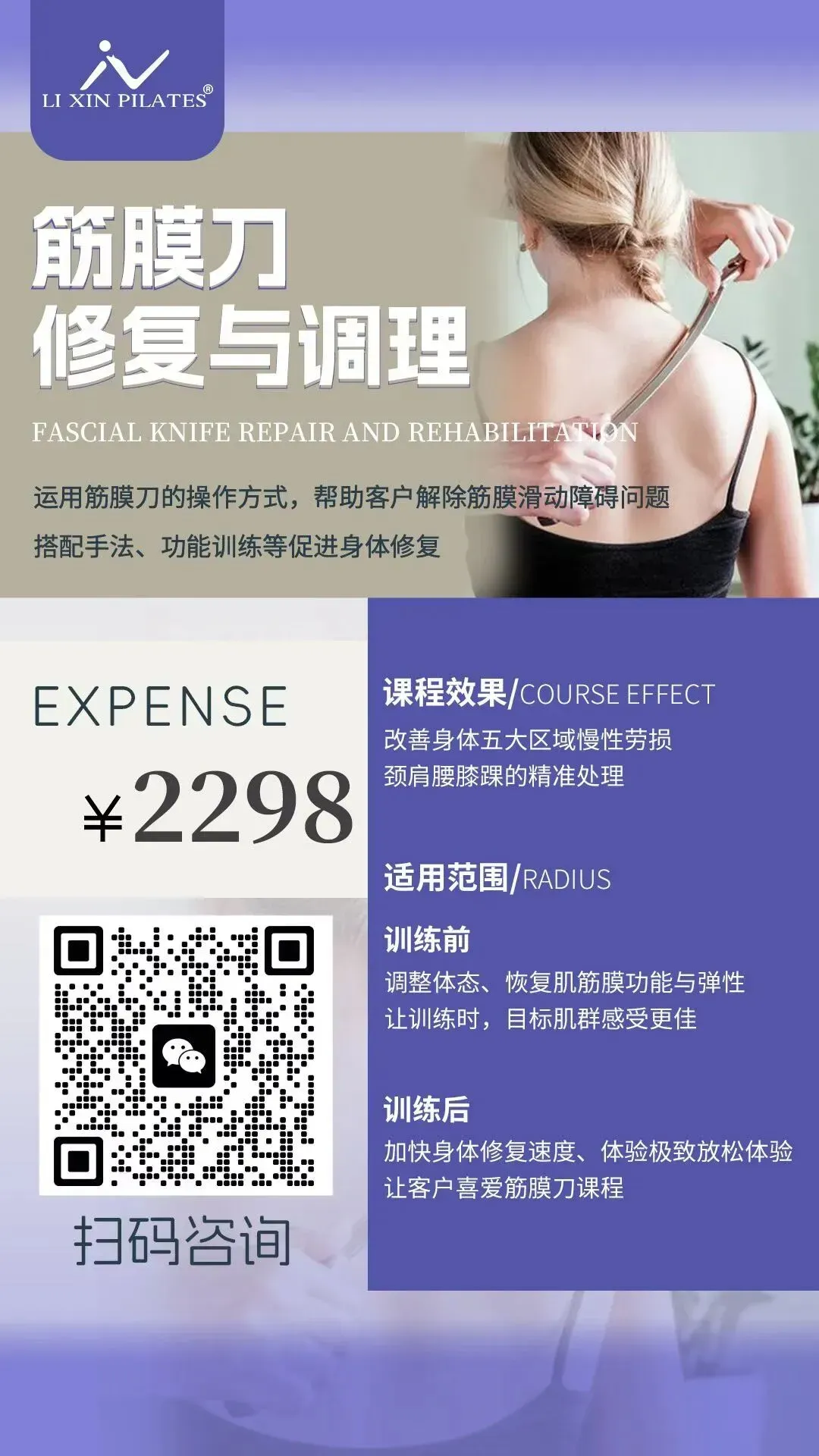 筋膜刀是一种以工具为辅助,软组织松动的治疗形式,结合筋膜释放技术,针对肌肉筋膜刀疼痛治疗的方法。对提升关节活动度、激活本体感受、疼痛治疗、肌肉松解、体态调整、筋膜炎症恢复、美体塑形等有立竿见影的效果。