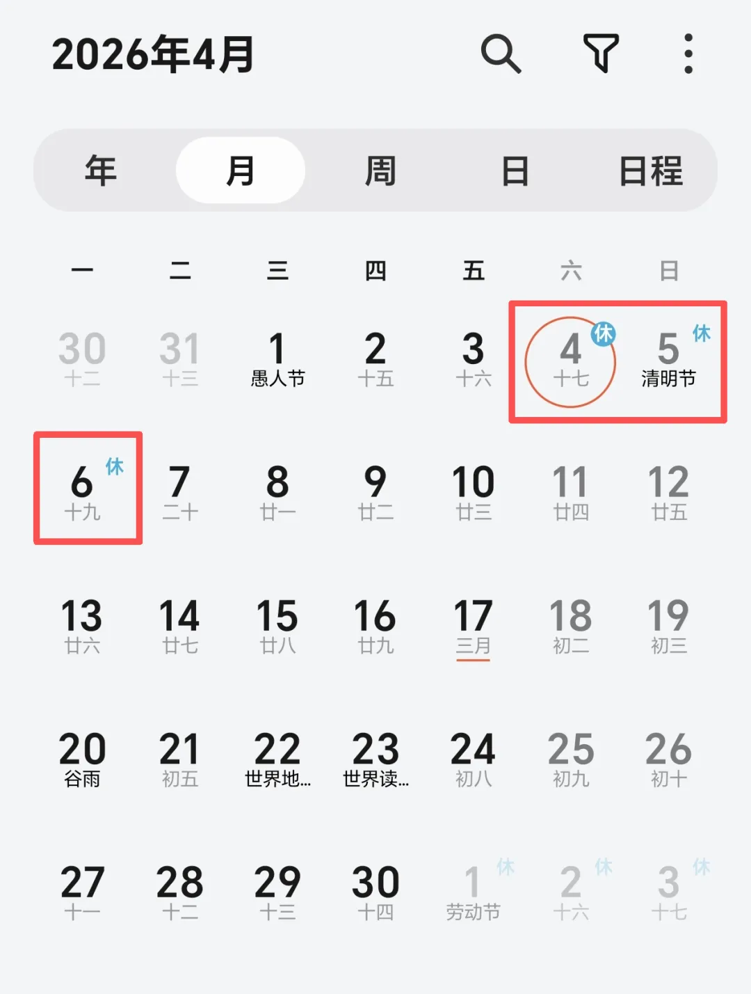 4月4日(周六)至6日(周一)放假,共3天,不调休。
