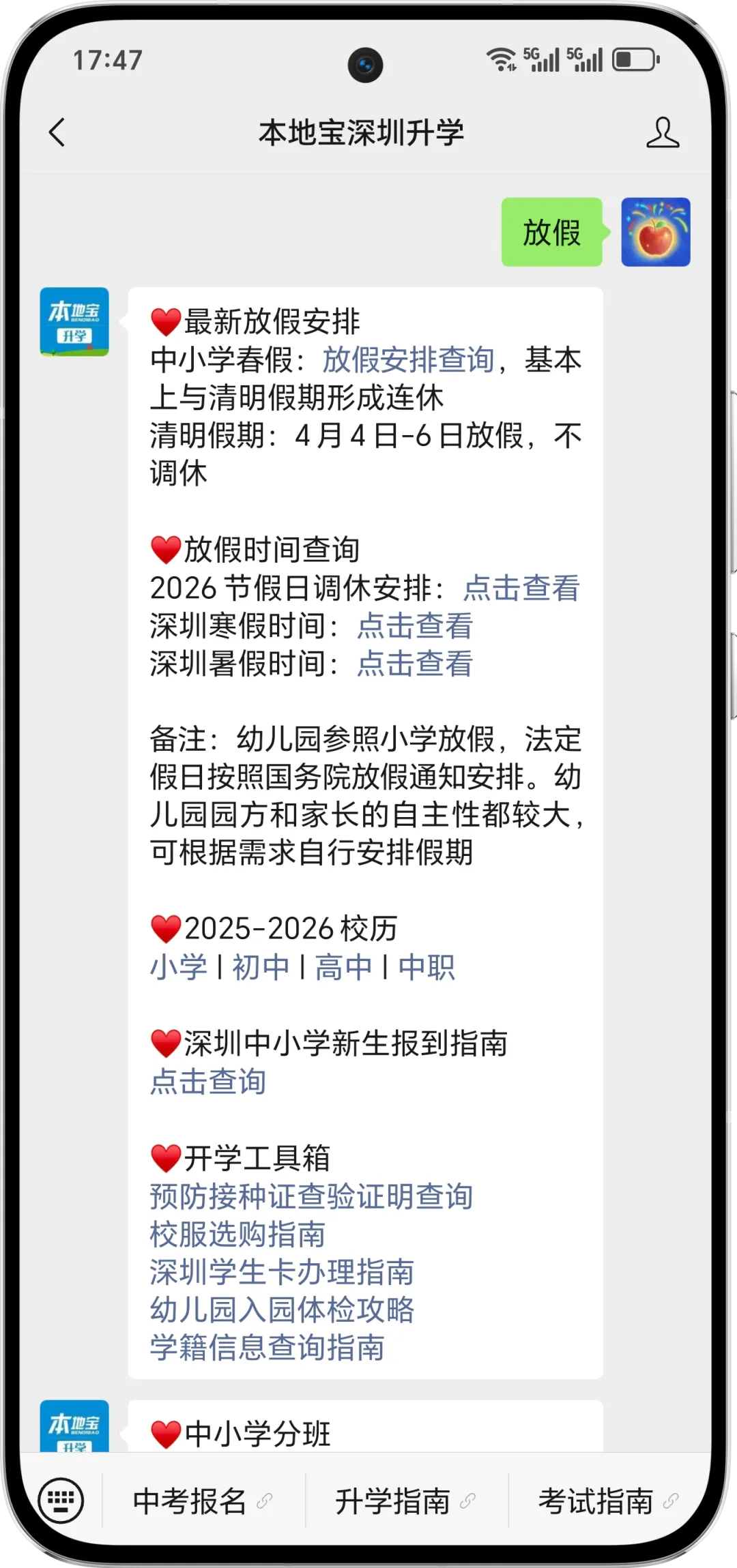 长按下方二维码,关注【本地宝深圳升学】回复【放假】获取2026深圳中小学最新放假时间、春假放假安排查询入口、校历等