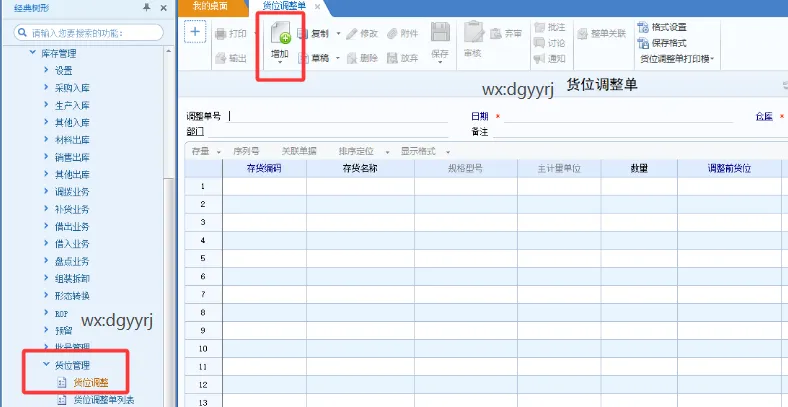 2、点击增加,输入仓库,存货,数量,调整前货位与调整后货位,如图下:
