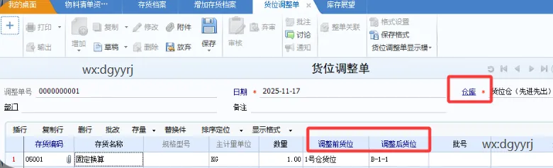 注意:同一个仓库+存货+批号之间的货位调整,如果是批号也不一致,建议使用形态转换单