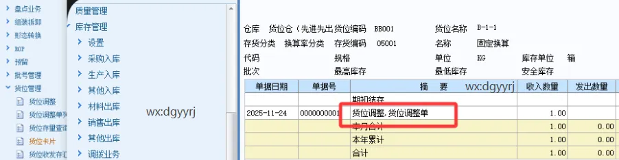 3、保存审核之后,可以查看货位卡片,货位收发存等报表,可以看调整数据,如图下: