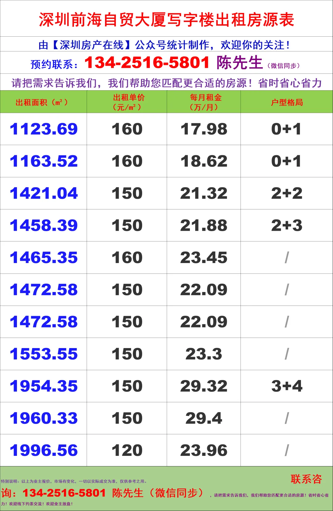 说明:市场有变化,以上房源数据仅供参考之用,一切以实际成交数据为准,【深圳房产在线】陈经理团队:134-2516-5801(微信同号)前海自贸大厦超甲级写字楼招租:前海妈湾核心地标,享政策红利与绿色智慧办公
