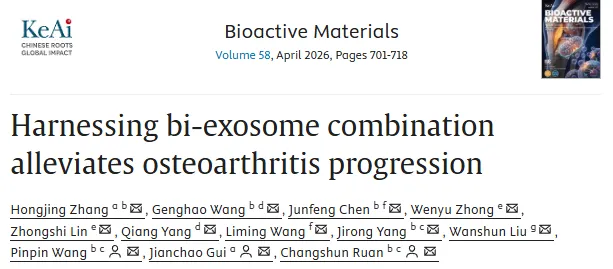 来自中国科学院深圳先进技术研究院的阮长顺等团队通过RNA测序分析,发现骨髓间充质干细胞来源外泌体(BMSC-Exo)与软骨祖细胞来源外泌体(CPC-Exo)具有差异化的miRNA富集特征:前者主要调控巨噬细胞功能,后者侧重调节软骨细胞活性。本文开发了双外泌体组合策略,通过联合具有抗炎作用的BMSC-Exo和抗分解代谢的CPC-Exo,同步调控巨噬细胞极化和软骨细胞表型,从而缓解骨关节炎进展。当通过甲基丙烯酰化透明质酸微球递送至大鼠膝关节腔后,该双外泌体组合通过改善关节炎症与分解代谢环境,显著延缓了OA进展,并进一步揭示了关键干预通路(包括miR-708–5p/NRP-1、miR-431/BRCA-1/PLK-1及miR-7a-5p/NOTCH-3)。本研究通过定制化设计外泌体组合实现多靶点调控,为OA治疗提供了新的潜在策略。相关工作以题为“Harnessing bi-exosome combination alleviates osteoarthritis progression”的文章发表在2026年02月02日的期刊《Bioactive Materials》。