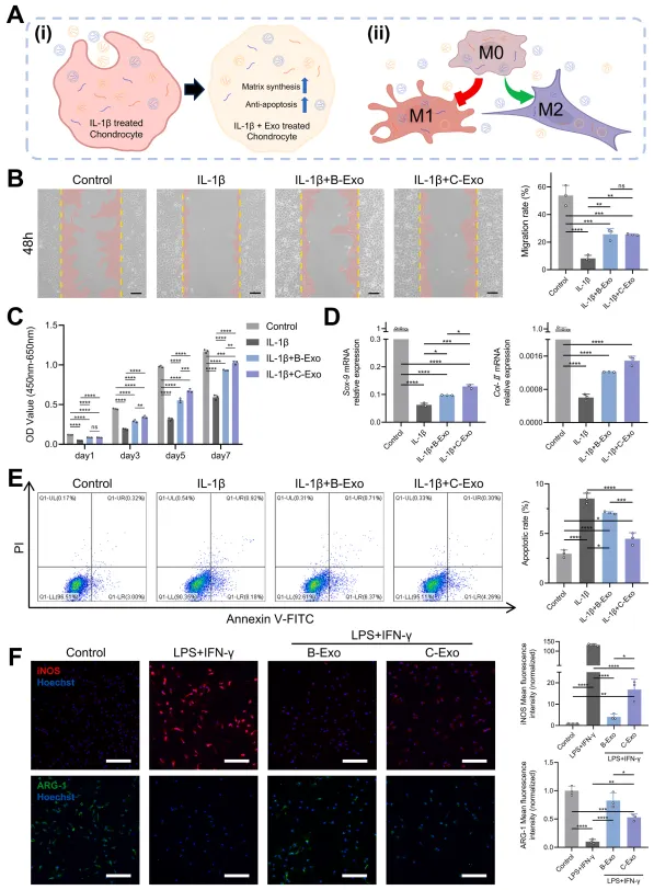 测序结果支持了本文的假设:外泌体可能是揭示骨髓间充质干细胞与软骨祖细胞在组织修复潜能差异的另一关键指标。具体而言,B-Exo在调控炎症反应和巨噬细胞行为方面表现更优,而C-Exo主要影响细胞合成代谢与凋亡过程。为验证其功能,本文选取了关节损伤与修复过程中的两类关键细胞——软骨细胞和巨噬细胞进行研究(图2A)。首先,通过IL-1β刺激软骨细胞建立体外骨关节炎模型,并分别用B-Exo或C-Exo进行处理。结果显示,两种外泌体均能显著改善IL-1β诱导的软骨细胞迁移与增殖能力(图2B、C)。在外泌体刺激2天后,C-Exo组表现出比B-Exo更显著的促增殖效果(图2C)。炎症环境会破坏软骨细胞合成-分解代谢平衡,导致软骨细胞外基质合成减少(表现为Sox-9和Col-II基因表达下调),而两种外泌体均能缓解这一趋势。与B-Exo组相比,C-Exo处理的软骨细胞中Sox-9和Col-II转录水平分别提高33.31%和22.21%(图2D)。通过流式细胞术检测外泌体对IL-1β诱导软骨细胞凋亡的影响,发现IL-1β刺激使细胞凋亡率从2.97±0.38%升至8.53±0.54%,而C-Exo组凋亡率(4.47±0.60%)显著低于B-Exo组(7.09±0.12%)(图2E)。综合来看,C-Exo在促进软骨细胞增殖、增强细胞外基质合成及抑制凋亡方面均优于B-Exo。
