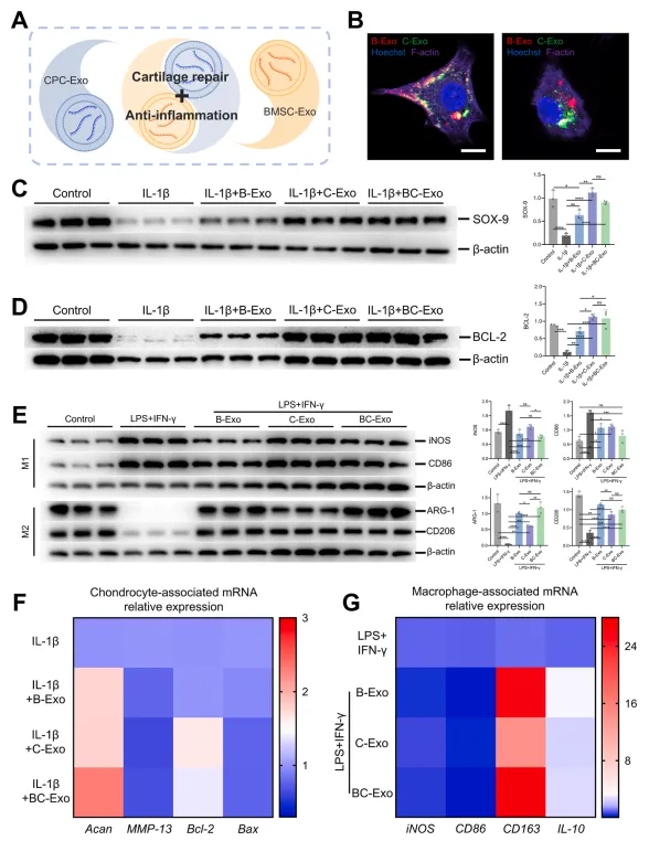 基于B-Exo与C-Exo的功能差异,本研究提出联合使用两种外泌体治疗骨关节炎的策略(图3A)。首先通过DiI和DiO分别标记B-Exo与C-Exo,细胞摄取实验证实两类外泌体均可被软骨细胞和骨髓源性巨噬细胞内化(图3B),这是其发挥生物学效应的先决条件。随后评估BC-Exo联合治疗方案对软骨细胞合成与分解代谢的影响:通过蛋白免疫印迹检测软骨形成特异性转录因子SOX-9发现,IL-1β组表达量最低,而IL-1β+B-Exo、IL-1β+BC-Exo及IL-1β+C-Exo组呈现递进式升高。其中IL-1β+C-Exo与IL-1β+BC-Exo组的SOX-9水平分别达到IL-1β+B-Exo组的1.77倍和1.43倍(图3C)。qRT-PCR结果显示,BC-Exo组的蛋白聚糖(Acan)基因表达量较B-Exo组提升1.31倍,较C-Exo组提升1.29倍(图3F)。作为软骨细胞外基质的主要结构成分,Acan基因表达上调提示BC-Exo在IL-1β存在环境下可能具有更强的促软骨修复作用。