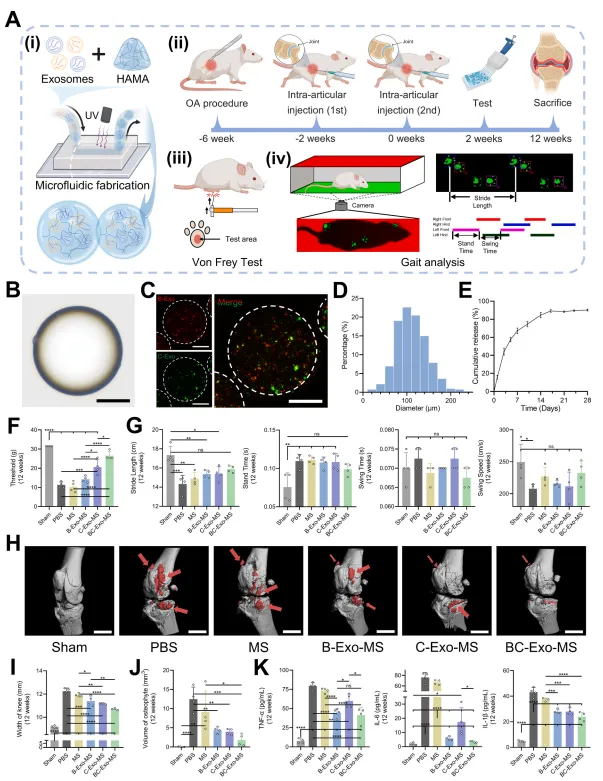 将外泌体负载于生物材料中,可实现其在关节腔内的持续稳定释放,从而延长治疗效果。本研究开发了可注射水凝胶微球作为外泌体的递送载体。如图4A(i)所示,通过微流控技术将外泌体封装至HAMA中形成微球。负载外泌体的HAMA水凝胶经流变学分析表明,HAMA-Exo与纯HAMA在紫外光交联后储能模量均从0.01 Pa急剧上升至约45 kPa,说明外泌体的掺入未损害HAMA水凝胶的光交联能力。在测试温度范围(10–40°C)内,外泌体的加入未显著改变HAMA水凝胶的热敏特性。随后采用微流控系统制备了三种负载外泌体的HAMA微球:B-Exo-MS、C-Exo-MS及BC-Exo-MS。显微观察显示,水凝胶微球在油相与水相中均保持优异的形态完整性(图4B),平均直径为111 ± 35 μm(图4D)。荧光标记实验进一步证实,B-Exo与C-Exo在微球内负载水平相近且分布均匀(图4C),这一特性有利于实现平稳的持续释放。