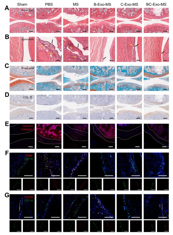 滑膜组织的H&E染色显示,PBS组和MS组均出现滑膜衬里细胞显著增多、细胞密度明显升高及血管翳形成等病理改变,而B-Exo-MS与BC-Exo-MS治疗能有效缓解这些病变(图5B)。滑膜炎评分证实,B-Exo-MS与BC-Exo-MS在减轻滑膜炎症方面疗效相当(P=0.9539),且均显著优于C-Exo-MS(P值分别为0.0055和0.0324)。同样,滑膜免疫荧光染色显示,B-Exo-MS组和BC-Exo-MS组的CD86+细胞比例显著低于PBS组和MS组;而CD206+细胞比例则显著高于PBS组和MS组。C-Exo-MS组的CD86+与CD206+细胞比例在五组中处于中间水平(图5F、G)。这表明B-Exo与BC-Exo均能通过诱导巨噬细胞向M2型极化,缓解病理性的炎症微环境。