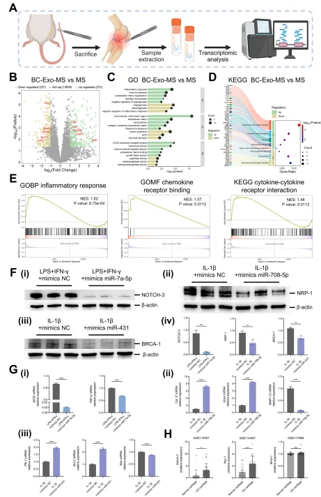 本文后续的研究聚焦于解析BC-Exo调控炎症、促进细胞外基质合成及推动软骨再生的潜在机制。通过对BC-Exo-MS组与MS组大鼠膝关节软骨区域组织进行治疗后2周的转录组分析(图6A),差异表达基因热图显示组间基因表达谱存在显著差异。差异基因火山图进一步凸显了BC-Exo对炎症调控与软骨修复的影响,共鉴定出272个上调基因与237个下调基因(BC-Exo-MS组 vs MS组),其中标记出五个代表性相关基因(图6B)。通过GO富集分析与KEGG通路分析,进一步明确了这些差异基因的功能意义。在BC-Exo对基质再生与软骨修复的作用方面,GO分析显示相较于MS组,BC-Exo-MS组的上调基因(如Col-IIa1与Cytl1)主要参与细胞外基质合成、含胶原细胞外基质生成及软骨稳态调控(图6B、C)。同时,下调基因表明BC-Exo处理抑制了金属肽酶的表达(图6C)。包括MMP-3与MMP-13在内的多种基质金属蛋白酶是软骨基质降解的关键介质。