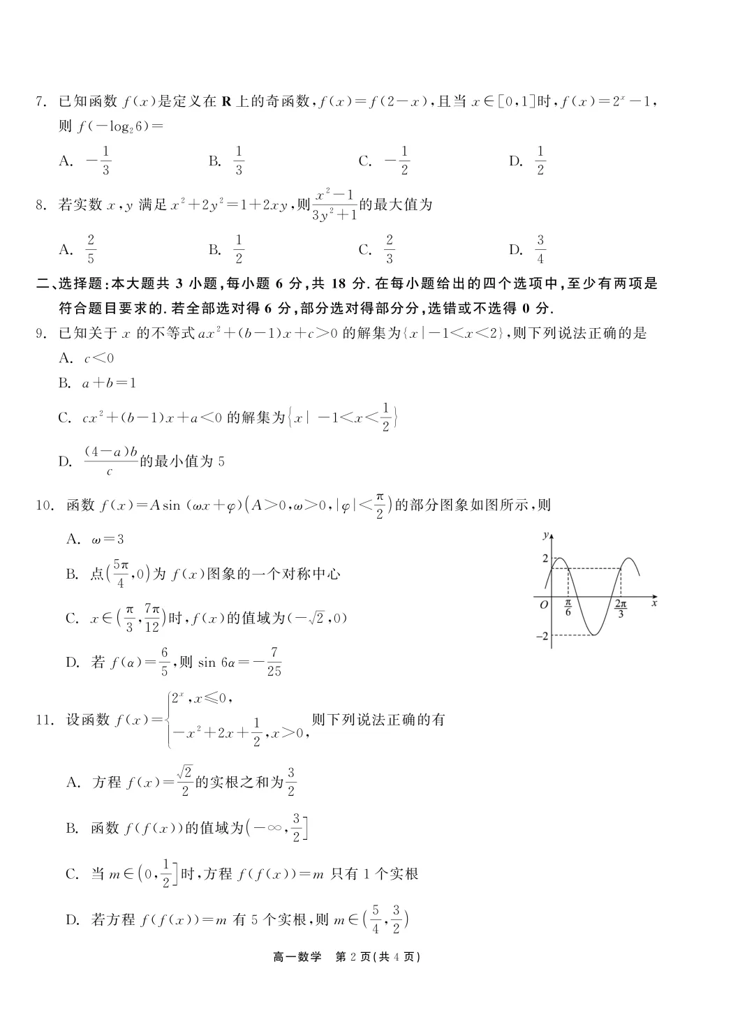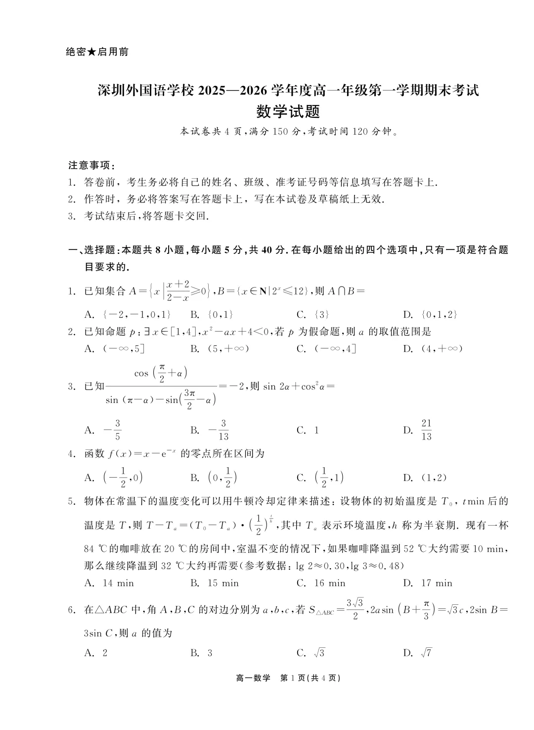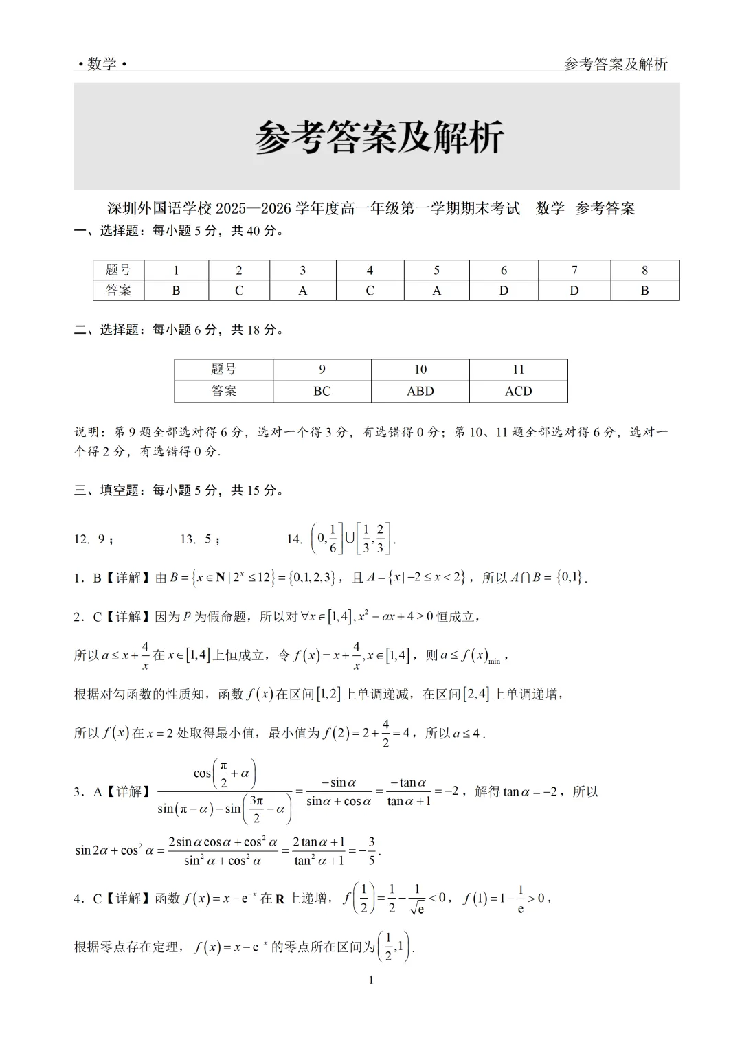 深圳外国语学校2025-2026学年上学期高一期末数学试题及答案解析