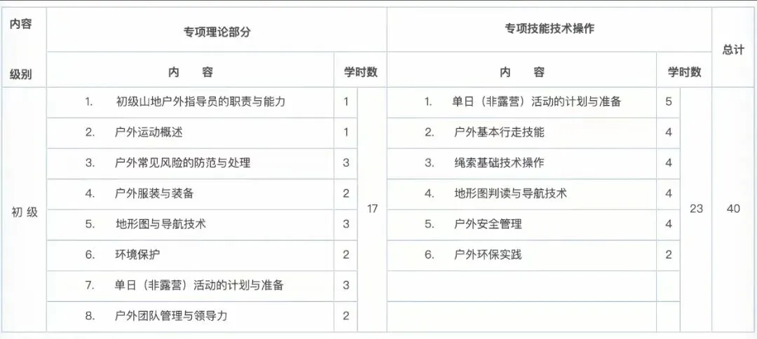 说明:初级山地户外指导员证书持有者可直接申请“中国登山协会三级山地户外运动技能培训证书”,该证书是其申报山地户外运动水平等级的必要条件。