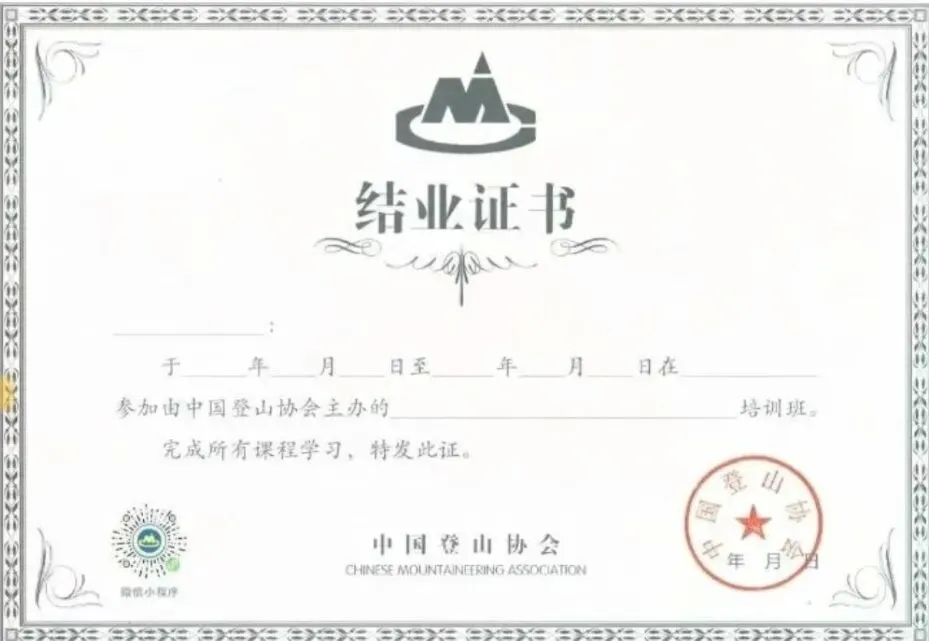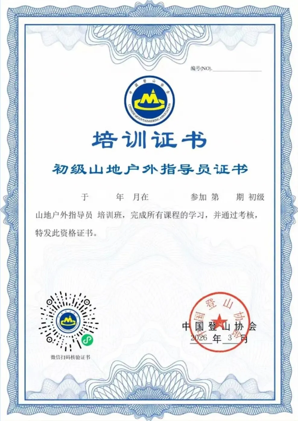 认真参加培训,学习态度端正,培训结业,将获得由中国登山协会颁发的“初级山地户外指导员培训”结业证书。经考核通过,将获得“中国登山协会初级山地户外指导员”电子证书,登录中国登山协会户外教培平台(小程序)查询并下载电子版证书。