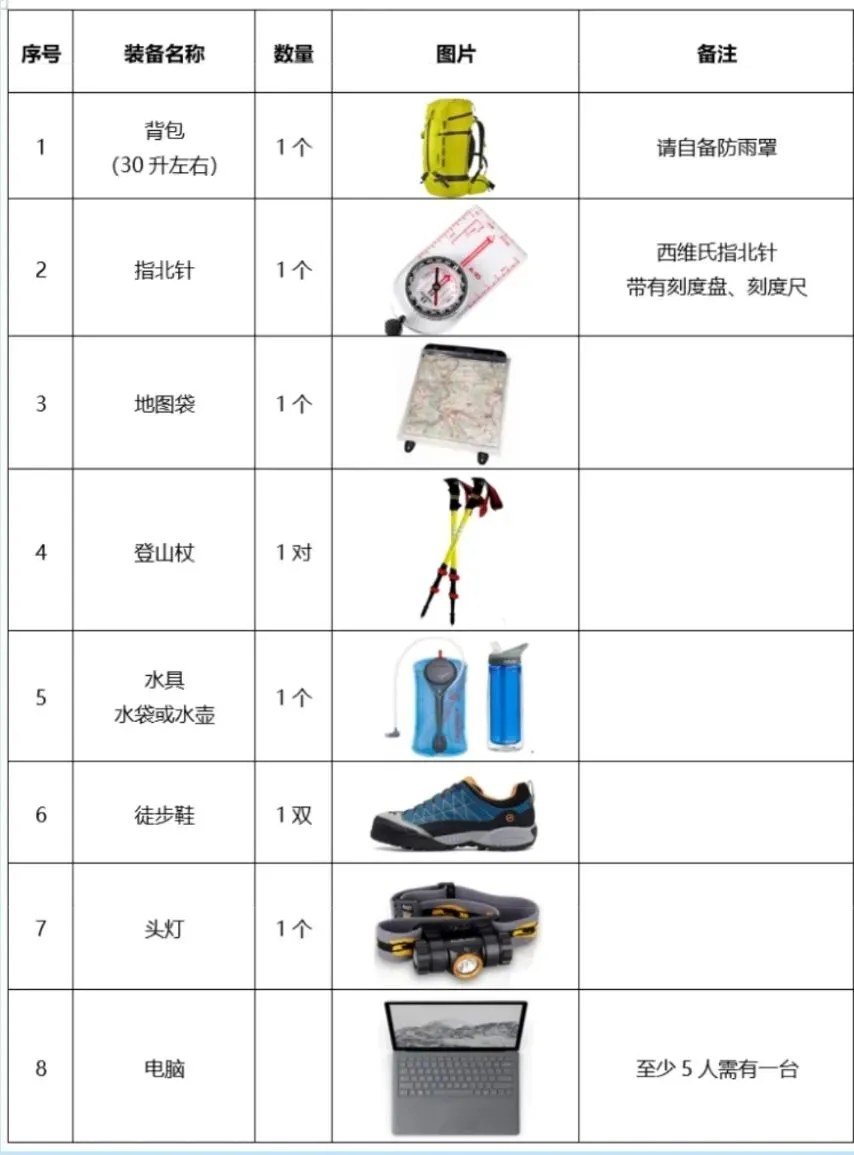 1、装备清单中所列的所有装备均须自备,此表中的装备仅为对应培训班必备的最少量装备要求,如个人衣物、防寒衣物、洗漱用品、急救包等则需根据个人情况另行自备;