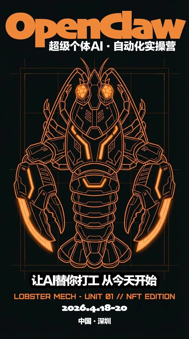 OpenClaw🦞龙虾 · 超级个体AI自动化实操营 ⭕️2026年4月18日-20日 | 中国·深圳 从今天开始,让AI替你打工。 我们不追求覆盖所有AI工具。 我们只追求一件事:让你建立AI工作流的思维方式。工具会变,思维不变。 但让AI帮你提效和变现的目标永远不变