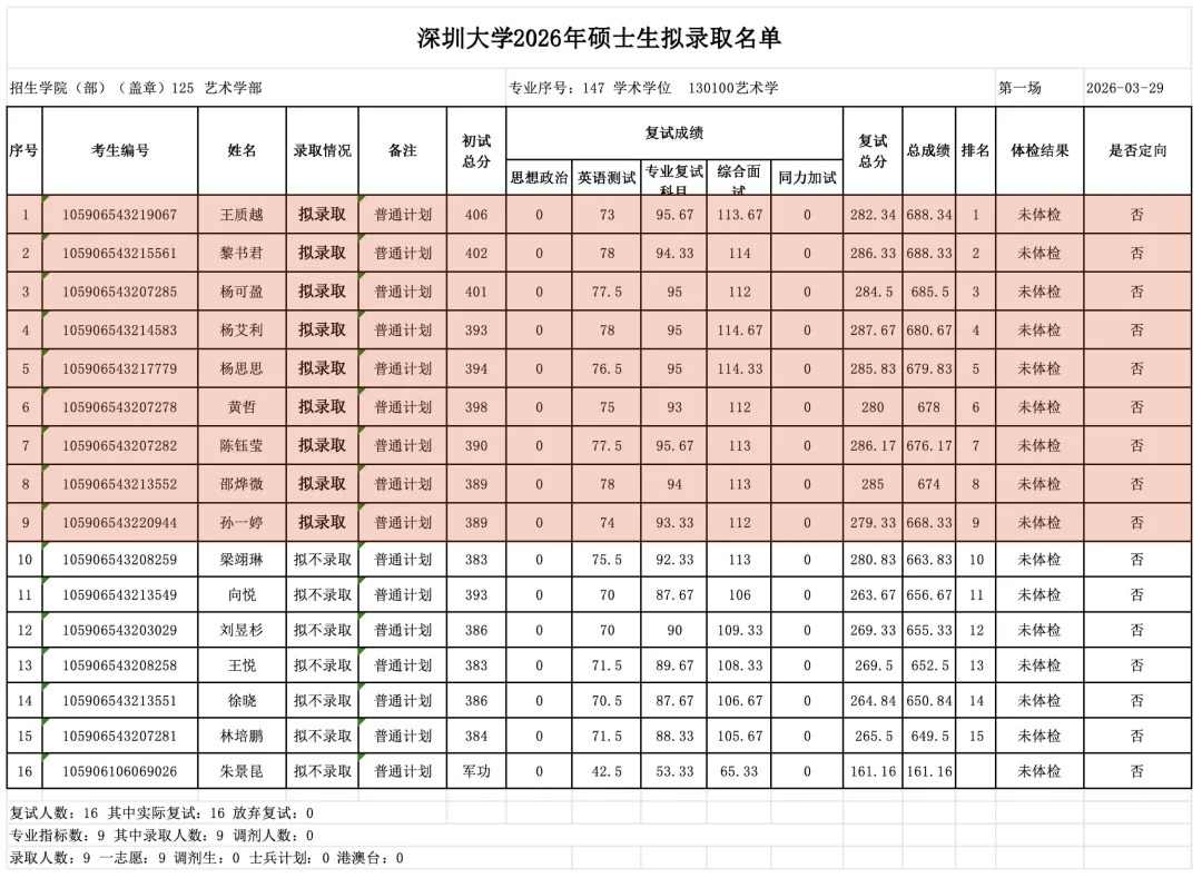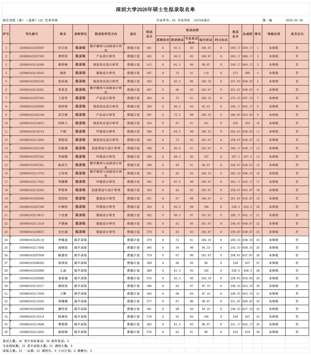 2026年深圳大学艺术学部拟录取名单发布【工作室共有15名同学录取!!!】