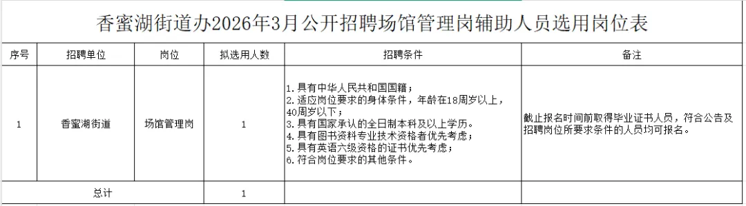 香蜜湖街道办于2026年3月面向社会公开招聘场馆管理岗辅助人员。现就有关事项公告如下: