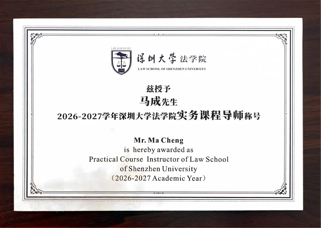 2026 年 3 月 28 日下午,马成律师以企业职务犯罪辩护实务与策略为核心内容,在深圳大学为硕士研究生开展第三场专题授课。课后,深圳大学法学院授予马成律师“2026-2027 学年深圳大学法学院实务课程导师”称号。