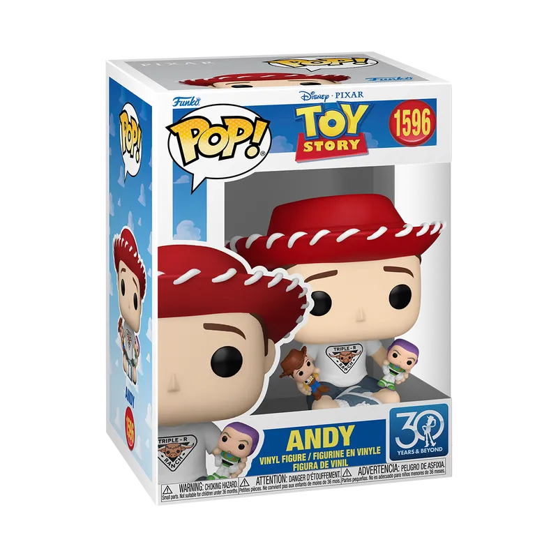 Funko Pop! 玩具总动员 30 周年纪念版安迪手办,迎接今年即将上映的《玩具总动员5》电影。安迪头戴杰西红帽,穿白T恤、蓝短裤与蓝白鞋。盘腿坐姿,双手分别抱着迷你胡迪和巴斯光年。