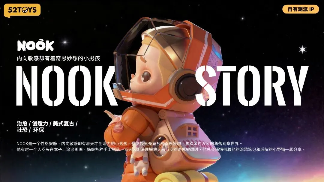 52TOYS以 "玩点有趣的" 为品牌主张,秉承好玩,有趣的品牌基因,通过独特的IP孵化,产品开发和服务,在全球范围內持续传递快乐与陪伴。产品覆盖静态玩偶、毛绒玩具、变形机甲和拼装模型等六大品类,更有POUKA、NOOK、CiCiLu 、LITTLE BUNS、Panda Roll、NINNIC等自有潮流IP的全新产品。
