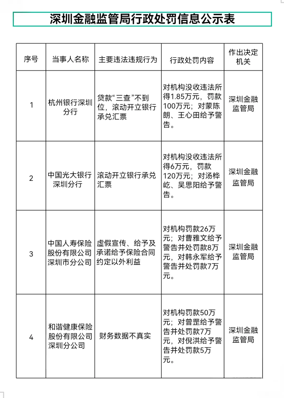 3月27日晚,深圳金融监管局发布了最新的行政处罚信息公示表,指向深圳辖区多个金融机构,涉及股份行、城商行、国有保险机构等。