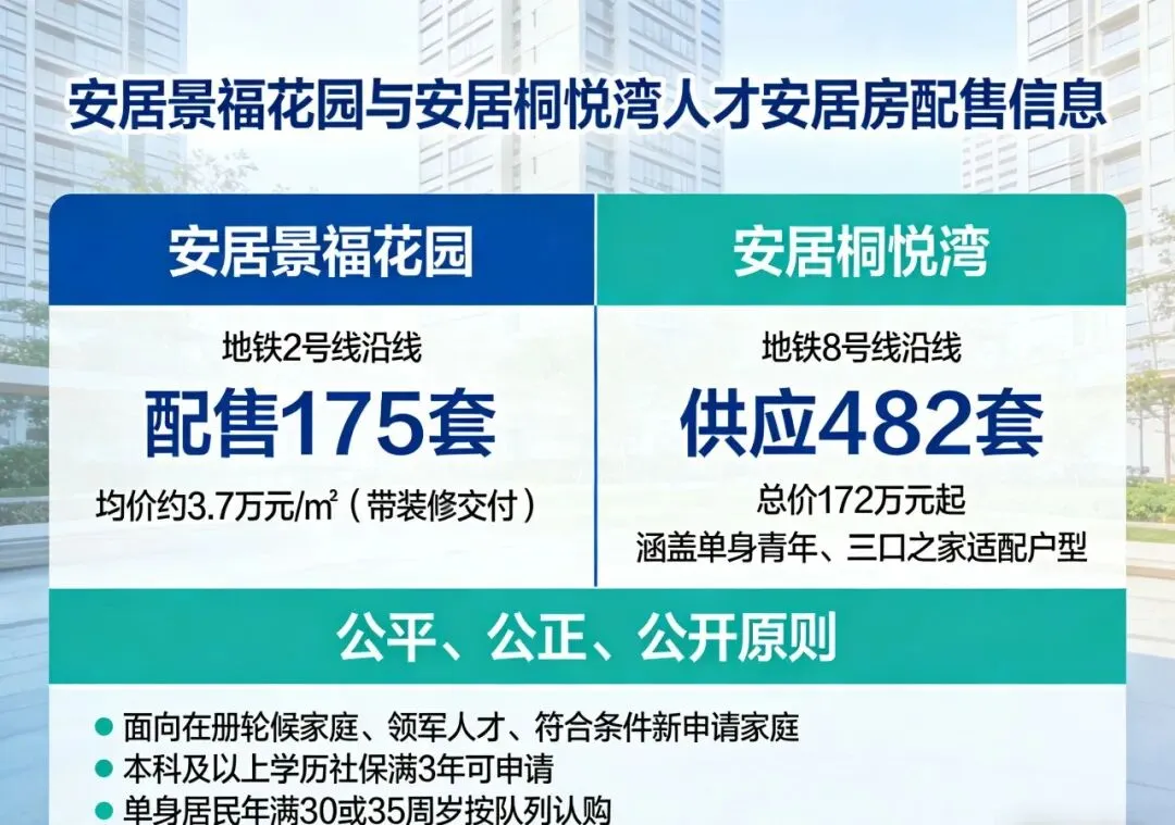 安居景福花园与安居桐悦湾则分别坐落于地铁2号线和8号线沿线,交通出行十分便捷。其中,安居景福花园本次配售175套人才安居房,均价约3.7万元/㎡(带装修交付);安居桐悦湾供应482套房源,总价172万元起,涵盖市场主力需求户型,无论是单身青年还是三口之家,都能找到适配的居住空间。此次配售严格遵循公平、公正、公开的原则,分队列面向在册轮候家庭、领军人才及符合条件的新申请家庭,本科及以上学历者社保缴费满3年即可申请,单身居民年满30或35周岁可根据队列要求参与认购,人性化的申请条件,让更多奋斗者有机会实现“居者有其屋”的梦想。