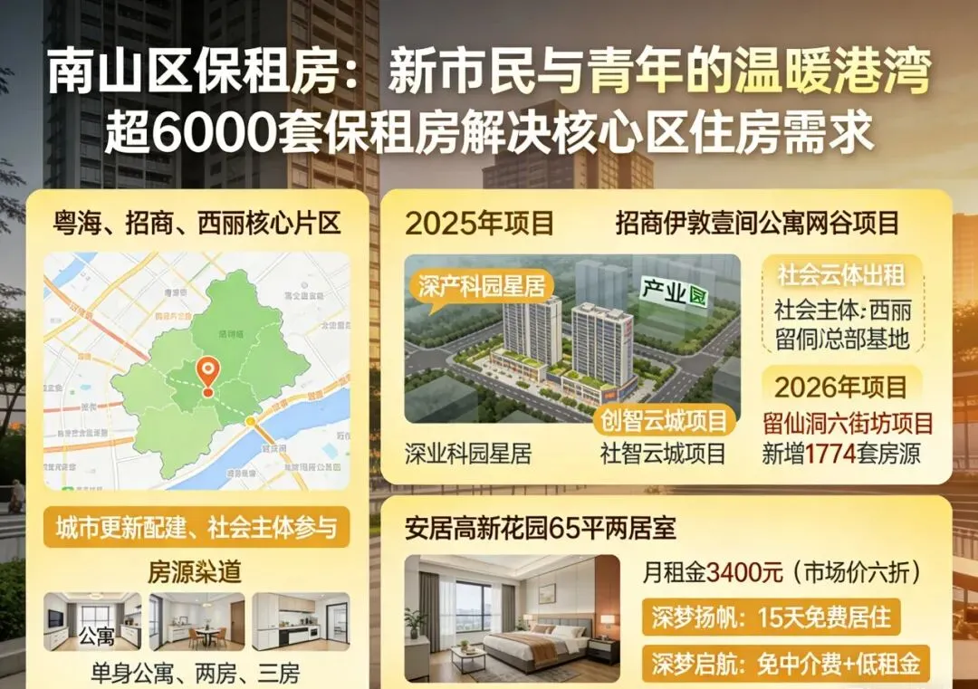 如果说安居商品房是为奋斗者扎根深圳提供的“定心丸”,那么南山区超6000套保租房的集中“上新”,则为新市民、青年人搭建了“过渡性安居”的温暖港湾。作为深圳科技创新核心区,南山区企业集聚、人才密集,住房需求尤为迫切,此次集中认定的保租房源,通过城市更新配建、社会主体参与等多元渠道筹集,累计超6000套,分布于粤海、招商、西丽等核心片区,实现“职住相融”,让上班族告别漫长通勤,把更多时间留给生活与成长。