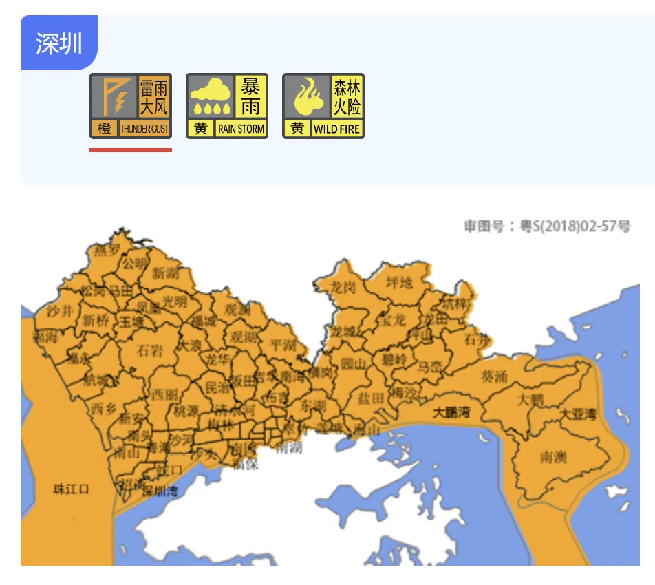 【深圳市雷雨大风黄色预警信号升级为橙色】受飑线系统影响珠江口西侧已出现10级左右最大阵风并伴有强雷暴,目前强雷雨云团继续东移,预计我市将自西向东出现强雷雨天气,局地最大阵风10级左右,并可能出现小冰雹。深圳市气象台2026年03月30日09时00分将全市雷雨大风黄色预警信号升级为橙色,全市暴雨黄色预警信号生效中,请迅速落实各项防风防雨防雷电措施;立即停止户外活动和作业。