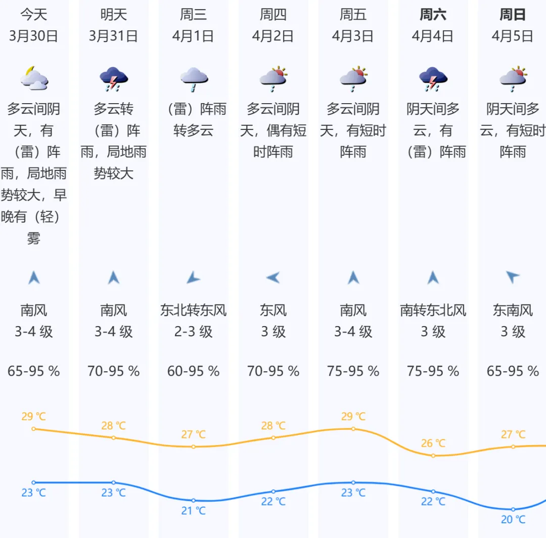 周四至周五(4月2-3日)阴天到多云,局地有短时阵雨或雷阵雨;