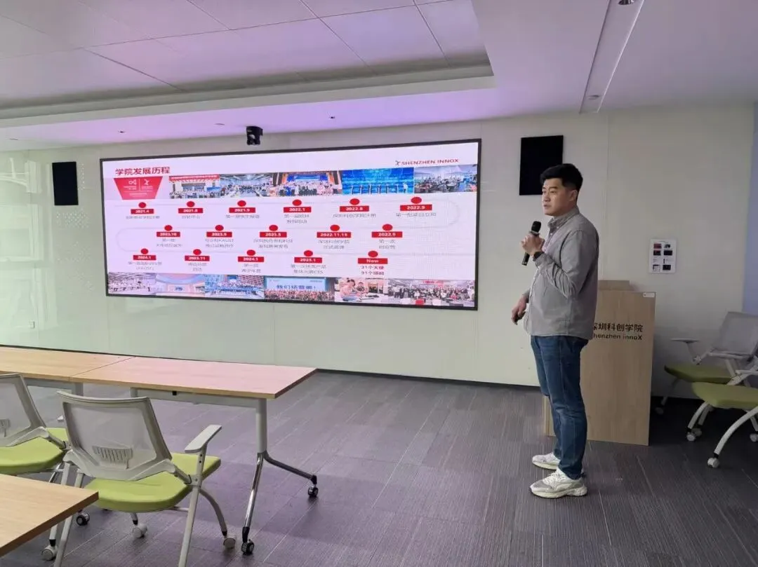 深圳科创学院政府公共事务部负责人修旭介绍了学院的发展策略:首先,通过四链融合的模式,实现人才创新资金产业的发展,并通过科创班的合作机制,重构课程体系,培养学生的创业能力。其次,通过不断迭代课程体系,打造人才库,为初创公司提供匹配人才的服务。最后,学院在深圳打造了一个供应链AI服务平台,为学员提供更便捷的供应链服务。