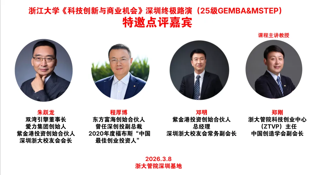 近日,浙江大学EMBA教育中心的《科技创新与商业机会》课程在深圳开课,由郑刚教授主讲,为25级浙大全球EMBA项目及浙大战略型企业家项目的同学们带来一场聚焦科创与商业融合的深度课堂。