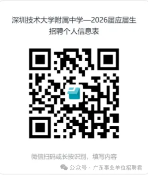 深圳技术大学附属中学2026年3月面向2026年应届毕业生公开招聘教师8名,应聘人员可通过深圳技术大学附属中学学校网站()、深圳技术大学(https://www.sztu.edu.cn/)、深圳市人力资源和社会保障局()查阅具体的招聘信息,具体岗位见《深圳技术大学附属中学2026年3月面向2026年应届毕业生赴外公开招聘教师岗位表》(附件1,以下简称《招聘岗位表》)。现就有关事项公告如下:1.2025年9月1日至2026年8月31日期间毕业的2026年应届毕业生(非在职)。毕业时间以毕业证书和学位证书落款时间为准,其中,国内普通院校2026年应届毕业生须于2026年8月31日前取得相应毕业证书、学位证书;在境内就读的中外合作办学2026年本科应届毕业生须于2026年8月31日前取得相应毕业证书和2026年12月31日前取得相应学位证书;中外合作办学院校仅颁发学位证书的须于2026年8月31日前取得相应学位证书;国(境)外院校毕业生须在2026年8月31日前取得学位证书。2.正在参加或服务期满且考核合格后2年内的基层服务项目人员。基层服务项目人员是指:我省招募的“大学生村官”、“三支一扶”计划、“大学生志愿服务西部计划”、“广东大学生志愿服务山区计划”等基层服务项目人员。3.2026年毕业的定向生、委培生原则上不得报考。(1)具有普通高校(非在职)研究生学历,并具有相应学位。(2)低学历不能报考高学历要求的岗位,高学历可以报考低学历要求的岗位,但必须符合岗位的专业要求,必须具备高学历相应的学位。如:学历要求为“本科”,则大专学历不能报考,本科和研究生学历可以报考;研究生学历报考的,除符合专业要求外,还应具有和研究生专业对应的学位。(1)应聘人员所学专业按所获毕业证书上的专业为准。辅修专业、学位种类均不作为专业依据。(2)招聘岗位中专业条件参照《广东省2026年考试录用公务员专业参考目录》(以下简称《公务员专业目录》,附件2)设置的,应聘人员应根据本人所学专业名称,与《公务员专业目录》中的专业名称进行对照,如专业名称一致的,则所学专业已列入《公务员专业目录》列表,按照该专业名称及代码进行报考,不得报考所学专业代码与招聘岗位专业代码不一致的岗位。岗位表中的“专业”要求为“学科门类”(代码为2位数)的,如应聘人员所学专业为该“学科门类”所含“学科”(代码为4位数)或“专业”(代码为6位数)的,均符合报考条件。若所学专业为《公务员专业目录》中旧专业名称的,按其对应的专业名称及代码进行报考。如旧专业后注明“部分”的,须征询招聘单位同意后报考。若所学专业已列入《公务员专业目录》(有专业代码),同时也为旧专业名称的,可以按照所学专业报考,也可以按照旧专业以相近专业报考。(3)应聘人员所学专业未列入《公务员专业目录》(无专业代码)的,可选择《公务员专业目录》中的相近专业报考,所学专业必修课程须与招聘岗位要求专业的主要课程基本一致,并在报名时提供毕业证书(已毕业的)、所学专业课程成绩单、课程对比情况说明及毕业院校设置专业的依据等材料。若招聘岗位专业条件为“专业”(代码为6位数),应聘人员所获毕业证书上的专业名称为该“专业”的上一级“学科”(代码为4位数)或“学科门类”(代码为2位数),可按前款规定以相近专业报考。(4)如应聘人员第二学位也取得了符合招聘岗位专业要求的毕业证书和学位证书,可以该毕业证书上的专业报考。毕业证书和学位证书均应当为国家承认的(如通过学信网验证等)学历学位证书。(5)应聘人员所学专业必须与岗位要求的学历层次相对应。如岗位要求学历为“研究生”,专业为“数学”,若考生本科的专业为“数学”,但研究生的专业为“物理”,则不符合要求。在《招聘岗位表》“与岗位有关的其它条件”中有年龄限制要求的,按《招聘岗位表》要求的年龄报考;其他条件中没有年龄要求的,报考的年龄均要求为40岁以下(截至公告报名首日,即为1986年3月30日以后出生的)。(1)考生须取得相应层次以及相应学科的教师资格证。报名时未取得的考生,符合教师法、《教师资格条例》等法律法规规定的学历标准、普通话水平、身体条件和心理条件等要求的,可先报名,但须承诺于2027年8月31日前取得相应层次及学科的教师资格证书,并签署承诺书(附件4)到期未取得者取消聘用资格。所有拟聘人员应在规定时间内取得相关资格证书后,方可办理入职手续。(2)其他证书。如岗位要求取得其他资格证书的,须于报名首日前取得。点击公众号,回复文字“0330”即可获得报名方式等时间:2026年3月30日8:00至4月3日17:30报名邮箱:,请将报名材料做成一个PDF文件发送至我校邮箱并扫描下方二维码同步填写报名信息:时间:2026年4月11日9:00-4月11日12:00;2.严格按照岗位要求报名。个人条件与报考岗位要求不符的,考试成绩无效,一切后果由报考者本人承担。网上报名的应聘者需按以下材料清单及顺序要求上传附件,现场报名的应聘者需按以下材料清单及顺序要求提交纸质版材料(相关材料还需核验原件)。①报名表(附件3,需贴电子照片,本人手写签名后扫描)。③学历及学位证书。研究生学历的考生,需同时提供本科学历及学位证书。尚未取得学历及学位证书的考生须提供毕业生推荐表(函)(加盖“研究生院〈处〉”的公章)和院系推荐意见(推荐表中已有的不需再提供)。如考生暂无法提