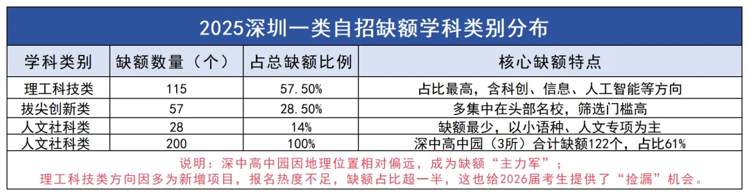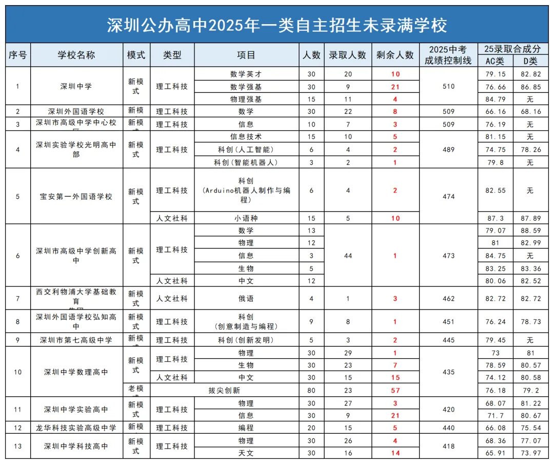 总缺额:2025 年深圳一类自招共剩余200个未录满名额,涉及13所公办高中(含四大名校相关校区);