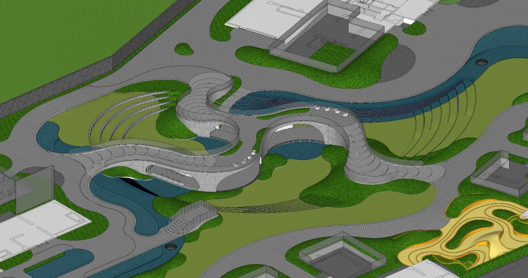为实现这一目标,我们以“立体分层 + 缓坡连接 + 高差转换”构建更有容量的公共空间系统:场地中部抬升约 2.1m,并结合局部下沉约 1.2m形成夹层与复合标高,从而获得可被持续感知的立体空间界面。上下两层分别承载不同强度与属性的活动功能——上层保证主要流线与公共面完整连续,下层提供更具围合度与遮蔽性的停留与活动场所,适应亲子、休闲与小型社交等多类型使用需求。