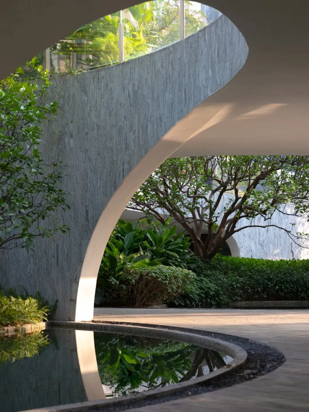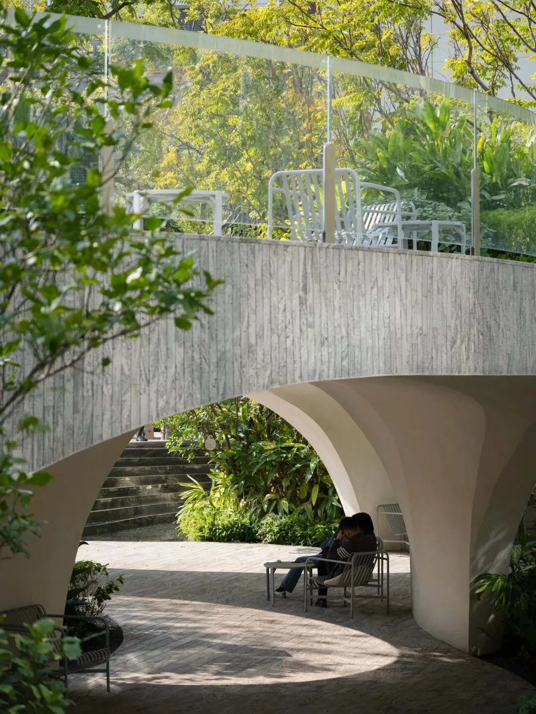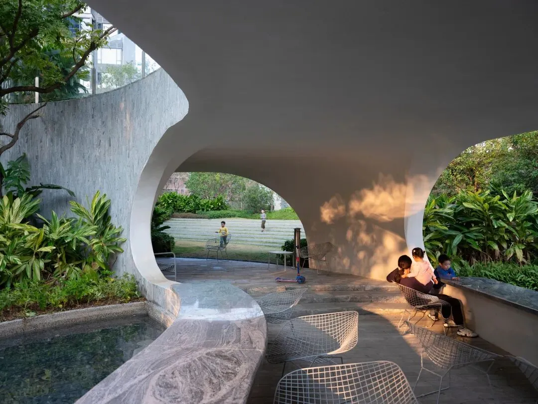 围绕水景,结构底部与拱下空间被处理为遮蔽型小场所。洞口式开窗把花园与水景引入视线,形成内外渗透的休憩界面;遮蔽带来的阴影与亭下空间感,使这一处空间在深圳漫长炎热的夏季与频繁多雨的气候下依然保持良好的可用性与舒适度。