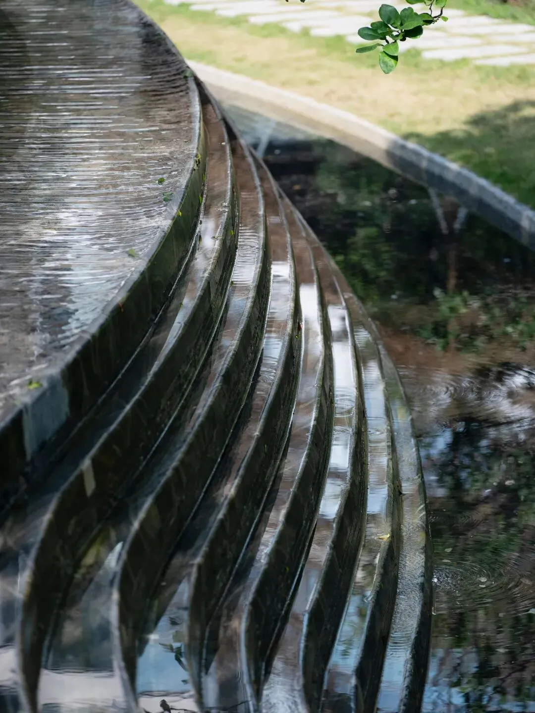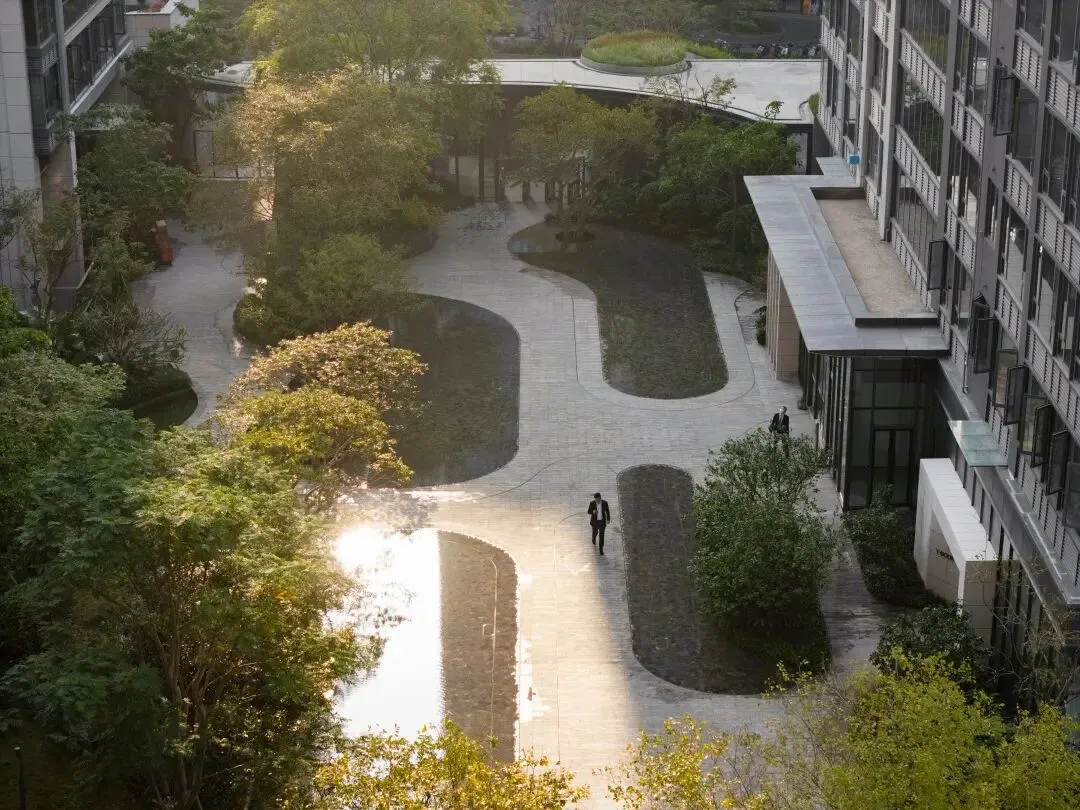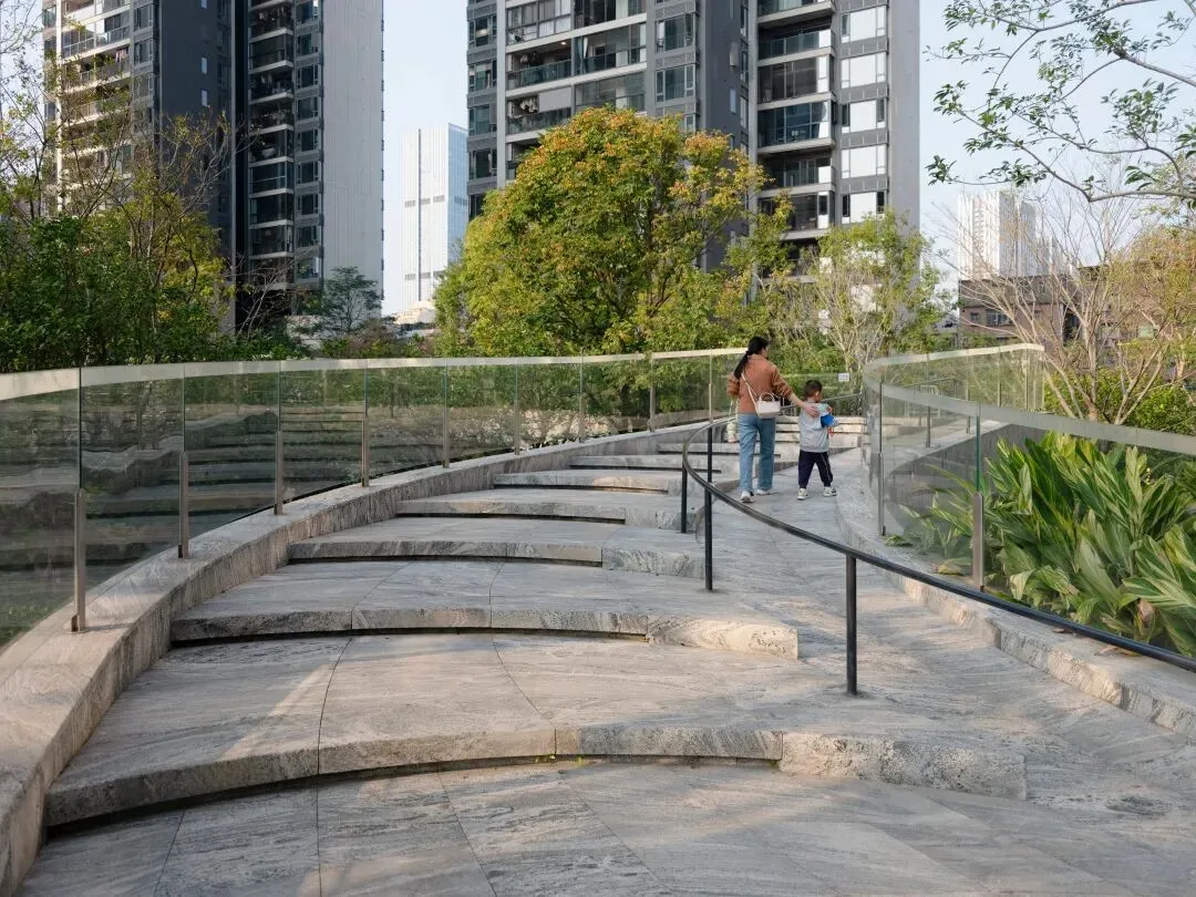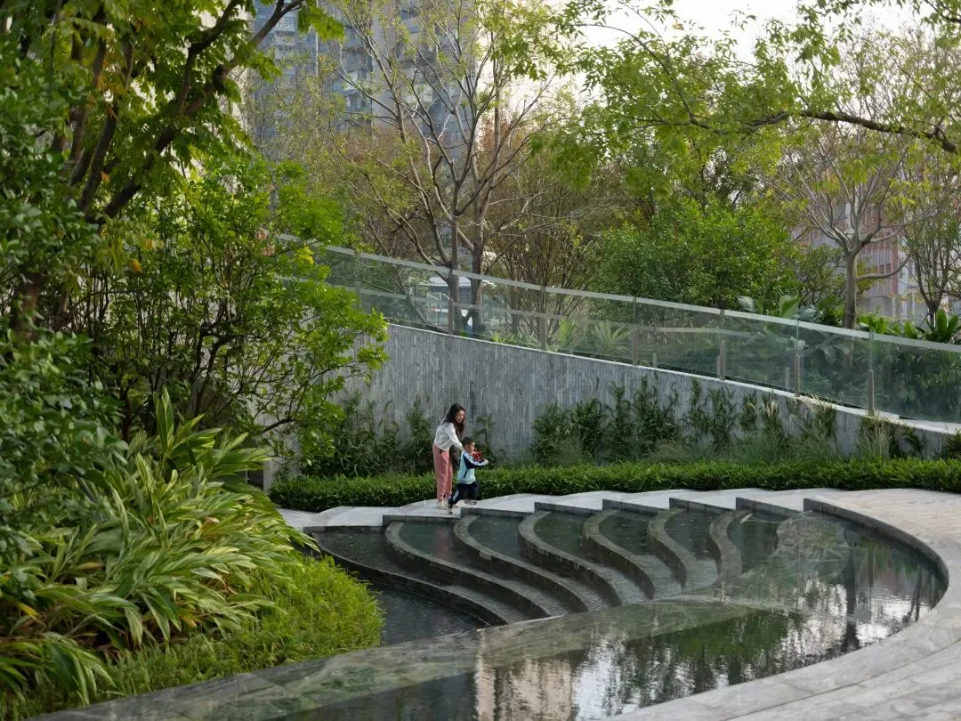 While meeting fire and evacuation requirements, necessary circulation widths are translated into everyday usable public paths. Along the route, water features are not single “nodes” but a series of interconnected forms—cascading steps, shallow stepping stones, reflective pools, and linear channels—creating rhythmic variation: some invite close interaction, some serve as transit, some as quiet viewing. These water features are integrated with the upper and lower garden layers: enhancing wayfinding and spatial recognition while embedding different user scenarios—family play, rest and viewing, stroller walks, small social gatherings—so that “safety compliance” and “daily experience” coexist along the same path.