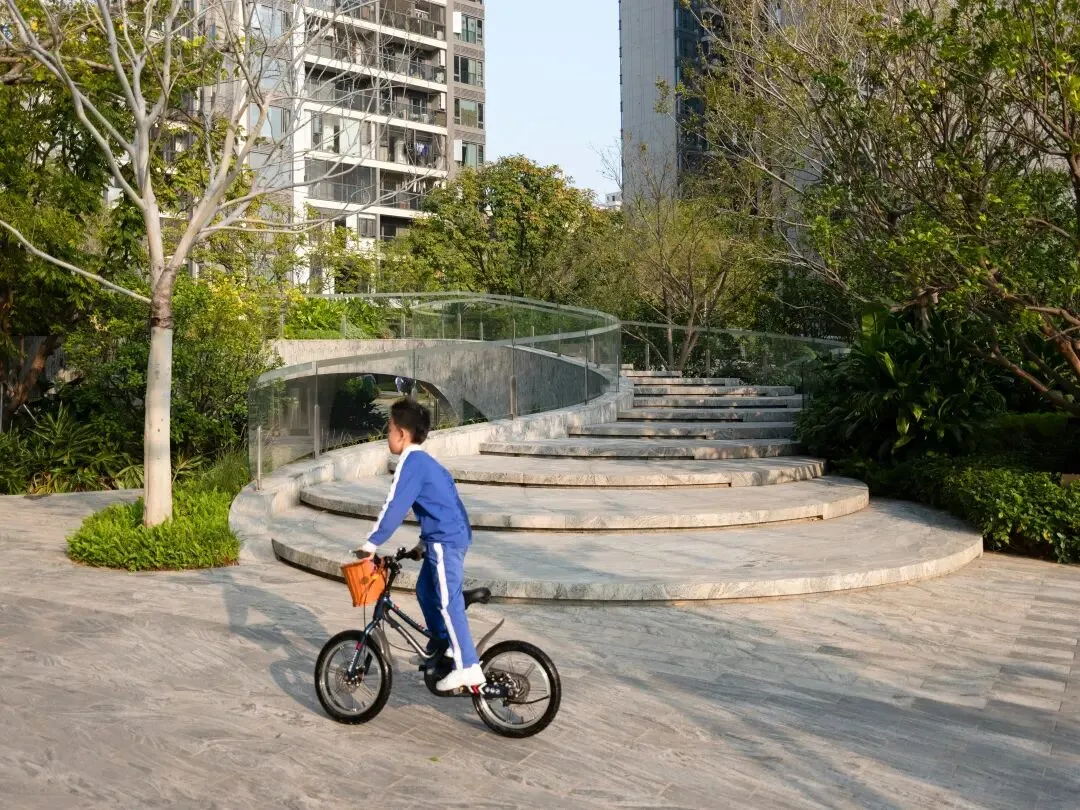 仁恒公园世纪三期是TROP在深圳新建成的居住区项目,以“一段连续的旅程”为核心,不把景观看作单一的地面,而是通过微地形的起伏与层层空间的串联,营造可漫游、可停驻的日常花园。路径以柔和坡度缓缓升降,在树影、水面与光线之间织就不断的行走节奏;空间时而开阔、时而收敛,引导身体移动,也让思绪游走。