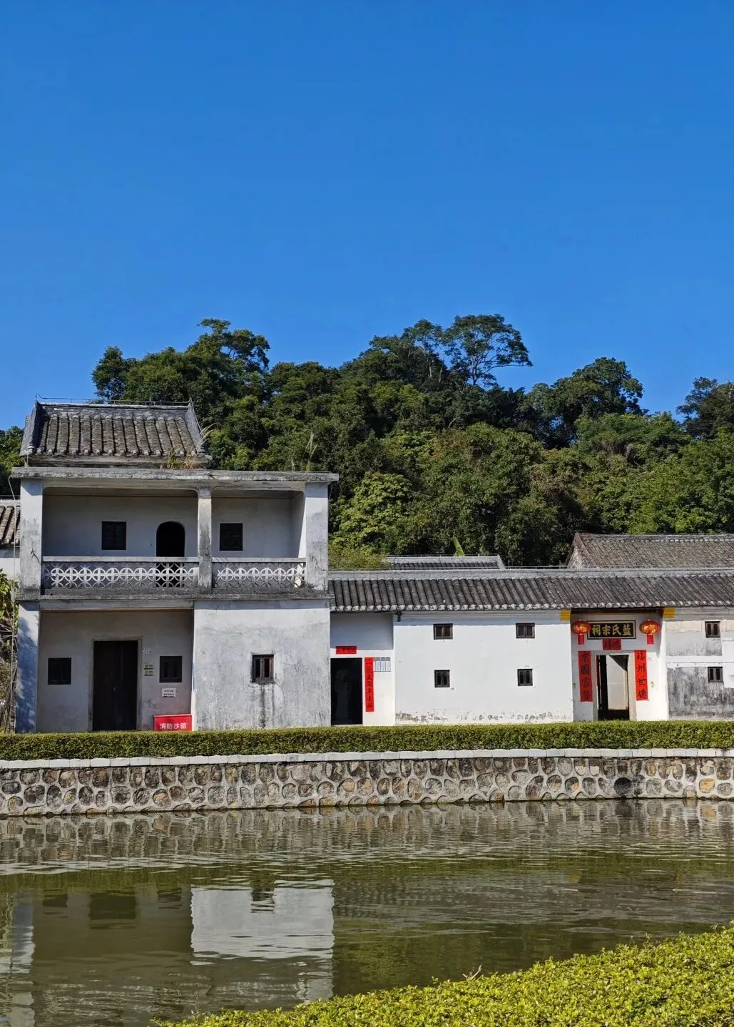 “蓝”是村里的大姓,“蓝氏宗祠”就在村子非常显眼的地方。顺势坐在风水池旁休息,看着瓦蓝的天、翠绿的树、波光粼粼的水,时不时还有小鱼扑通一声,跟大自然连接后真是心旷神怡、神清气爽。