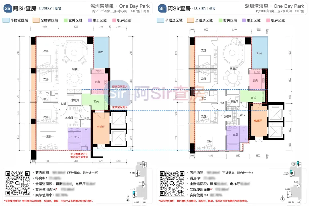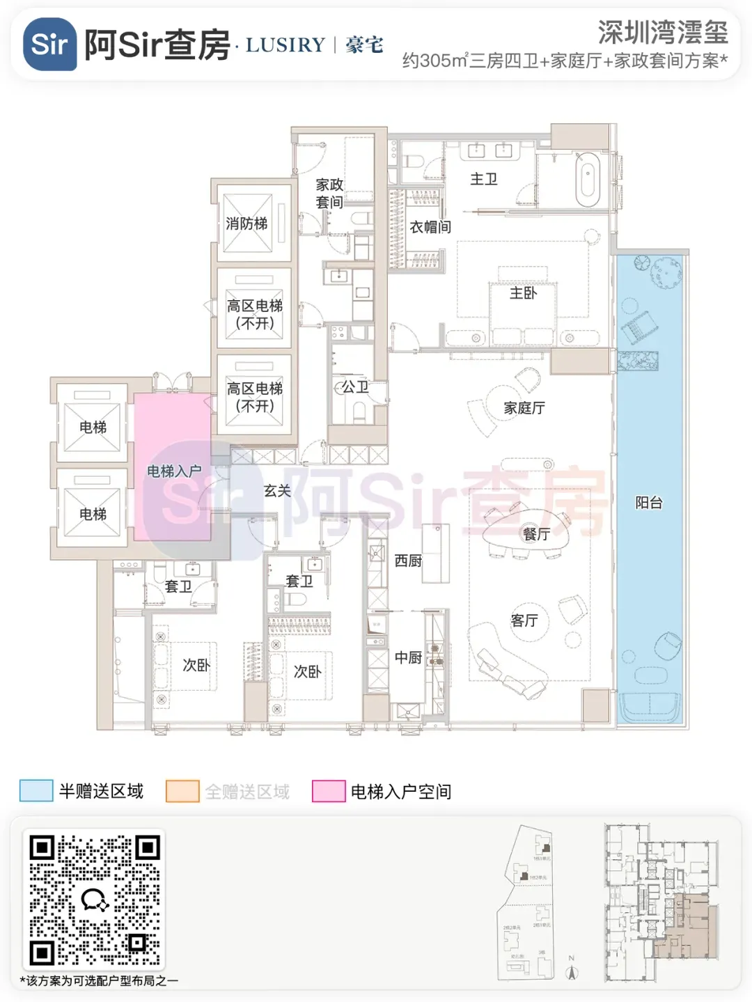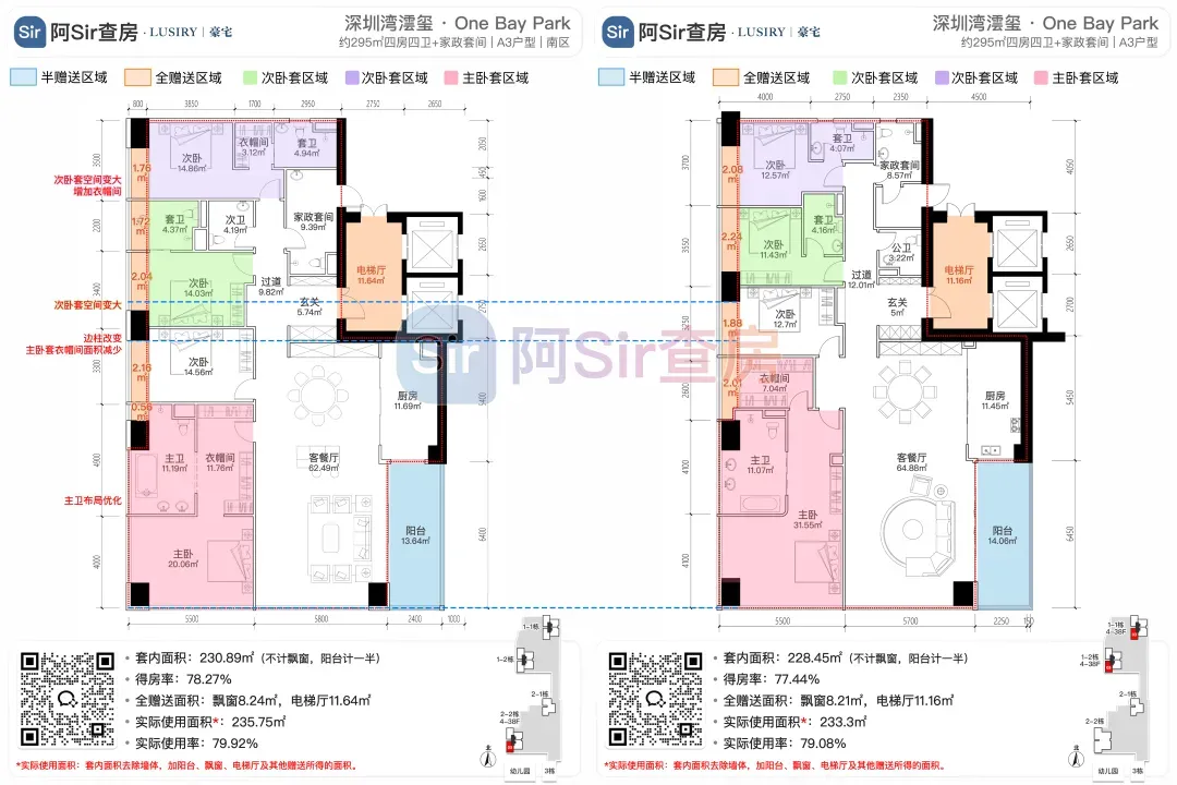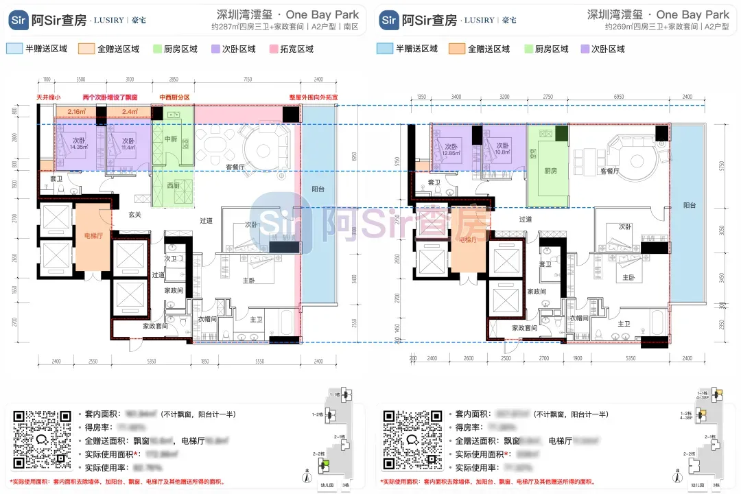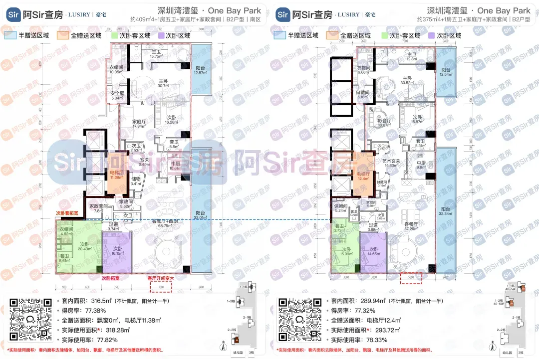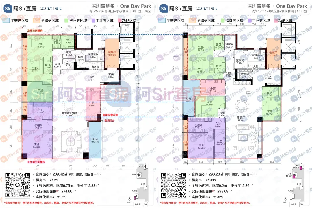 而位于1-1栋的北面距离「中海油大厦」比较近,在家里的北向落地窗都可以像《单身男女》一样,跟对面中海油小姐姐传情了。269㎡是209㎡的隔壁户,同样有两个方案可选,也是分为 三房三卫+家政套间 和 四房三卫+家政套间。最直观的区别也是把其中一个次卧改成了客厅,两个方案对比如下:- 269㎡三房三卫+家政套间方案把动区扩大串联超大阳台,光餐客厅有约65㎡,算上整个LDKB超过100㎡了。优点:整个动区超过100㎡,老实说Sir认为这个户型更应该做三房方案,太享受了,除了砍点实用性外没啥缺点。客厅动区空间穿插了一个次卧,可以满足大部分家庭的刚需居住空间。优点:实用性强,四个卧室基本上满足大部分家庭的刚需居住空间。不足:虽然增强了实用性,但玄关到客厅显得过道稍长,动线歪曲,不如三房户型来得开阔,且过道偏暗。阿Sir查房前期针对「深圳湾澐玺」组织了多次线下沙龙,当时不少老友们深度了解后纷纷考虑从209㎡加预算转投269㎡户型。主要考虑到该户型位于1-1栋的东面正对着街心公园,楼间距开阔,而1-2栋的东面对着小区园林,视野观感也非常舒服。对于景观和视野有执念的话,269㎡户型确实有更好的体验。另一个展示的样板间是295㎡户型,这个户型我现场细品了觉得尺度感不错,比单纯看户型图更能体现出来,整个室内空间非常之大,LDKB整体达到了90㎡左右。样板间展示的三房四卫+家庭厅+家政套间,另外还有一个可选方案就是正儿八经的四房四卫+家政套间,区别在于家庭厅的位置被拆分成了卧室和衣帽间。这个户型的功能设置和动线基本上可以满足二知三胎家庭的居住需求,不仅最大能够做到4+1房的功能,还有单独的家政套间,设计了主仆双动线。这里两个方案实质上都是可以有四个睡觉的空间,就不拆分来讲了。最大的优点是在中低区户型里实用性最强的,室内空间目测比305㎡还大。整个餐客厨的空间很开阔,阳台向东,客厅南向有5.8米的采光面,现场看这阳台并不小,毕竟有2.4米的深度,是个空间比例很好的阳台,好用。房间采光朝西,会有西晒,这方面虽然可以通过空调等高科技设备解决,不过西晒仍是不少人心中的隔阂,如果特别介意这个朝向则只能避开,去考虑269或305㎡的大面东向户型。另外有的老友说主卧门开在厅堂,呃,这个其实还好,毕竟主人家应该是在厅待到最晚的,而小孩住的次卧相对早睡,更应该远离动静大的客厅。如果次卧放到厅旁,晚上都不敢在客厅活动影响孩子休息。305㎡也没做样板间,同样有两个方案可选,也是分为 三房四卫+家庭厅+家政套间 和 四房四卫+家政套间,最直观的区别也是把其中一个次卧改成了客厅。两个方案对比如下:305㎡户型本质上是中低区里最动人的,即使它的阳台要花掉了两百多万,室内空间还没有295㎡大,动线稍微有点不完美,但坐落在东南角、空间分布均匀和全落地窗等还是让人无法太抗拒。老实说都305㎡还做三房的话,从理性角度看是不那么接受的,可能还没到那个level吧。而且动区如果想做大,把次卧敞开还不如把中厨敞开来得舒适。东南朝向,且两边都有园景,LDKB(餐客厨阳)空间有约86㎡,东向大阳台从客厅联通到主卧有近35㎡的阳台就离谱。还带有三个标准套间,卧室的空间分布均衡且好用。光看图没啥,后来对比后觉得比较遗憾的一个点客厅南侧开间只有5.1米,不如295㎡的5.8米南侧开间。如果想把动区做大,改中厨是最好的方式,但是中厨的灶台设在客厅墙边,如果改做半开放式中厨成本就会稍高,折腾。375㎡分两种户型,一个在东南户,一个在西南户,景观面都朝东看海。西南户大客厅独享东南向视野,与餐厅与起居厅共同组成了超尺度的大公区,并拥有西向的景观阳台。主卧室独享西南向转角位置,配以双向景观视野。