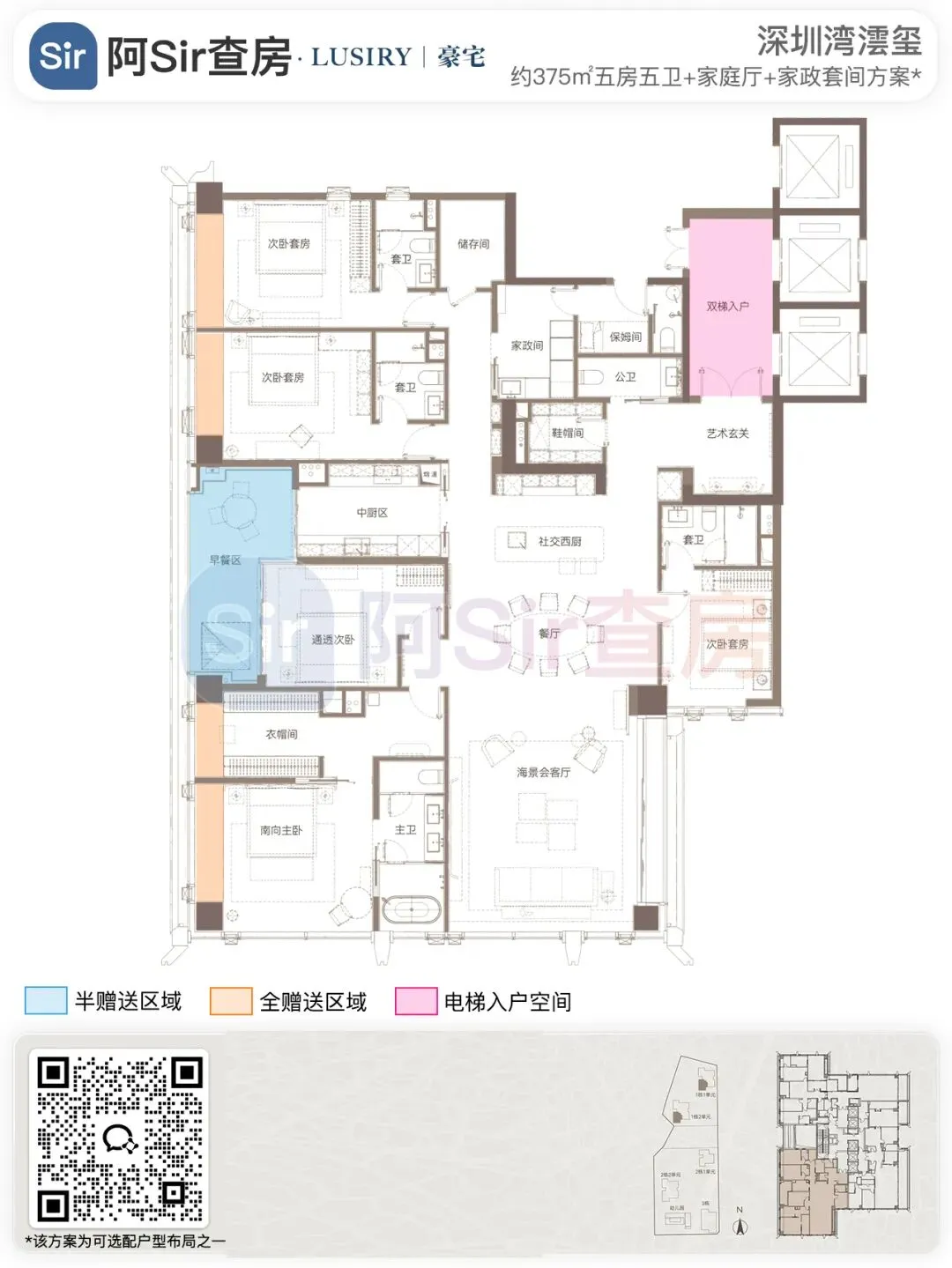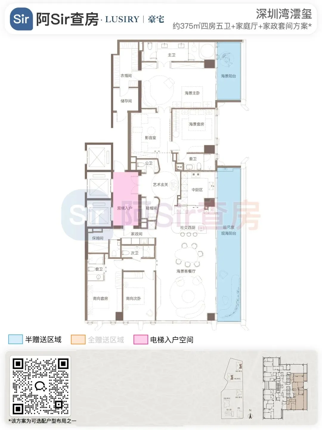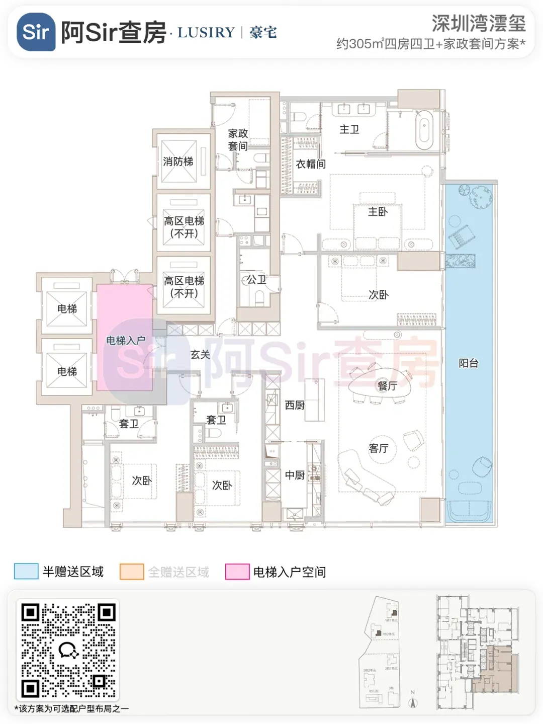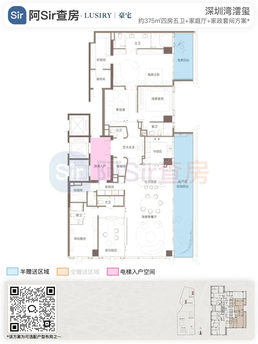 而位于1-1栋的北面距离「中海油大厦」比较近,在家里的北向落地窗都可以像《单身男女》一样,跟对面中海油小姐姐传情了。269㎡是209㎡的隔壁户,同样有两个方案可选,也是分为 三房三卫+家政套间 和 四房三卫+家政套间。最直观的区别也是把其中一个次卧改成了客厅,两个方案对比如下:- 269㎡三房三卫+家政套间方案把动区扩大串联超大阳台,光餐客厅有约65㎡,算上整个LDKB超过100㎡了。优点:整个动区超过100㎡,老实说Sir认为这个户型更应该做三房方案,太享受了,除了砍点实用性外没啥缺点。客厅动区空间穿插了一个次卧,可以满足大部分家庭的刚需居住空间。优点:实用性强,四个卧室基本上满足大部分家庭的刚需居住空间。不足:虽然增强了实用性,但玄关到客厅显得过道稍长,动线歪曲,不如三房户型来得开阔,且过道偏暗。阿Sir查房前期针对「深圳湾澐玺」组织了多次线下沙龙,当时不少老友们深度了解后纷纷考虑从209㎡加预算转投269㎡户型。主要考虑到该户型位于1-1栋的东面正对着街心公园,楼间距开阔,而1-2栋的东面对着小区园林,视野观感也非常舒服。对于景观和视野有执念的话,269㎡户型确实有更好的体验。另一个展示的样板间是295㎡户型,这个户型我现场细品了觉得尺度感不错,比单纯看户型图更能体现出来,整个室内空间非常之大,LDKB整体达到了90㎡左右。样板间展示的三房四卫+家庭厅+家政套间,另外还有一个可选方案就是正儿八经的四房四卫+家政套间,区别在于家庭厅的位置被拆分成了卧室和衣帽间。这个户型的功能设置和动线基本上可以满足二知三胎家庭的居住需求,不仅最大能够做到4+1房的功能,还有单独的家政套间,设计了主仆双动线。这里两个方案实质上都是可以有四个睡觉的空间,就不拆分来讲了。最大的优点是在中低区户型里实用性最强的,室内空间目测比305㎡还大。整个餐客厨的空间很开阔,阳台向东,客厅南向有5.8米的采光面,现场看这阳台并不小,毕竟有2.4米的深度,是个空间比例很好的阳台,好用。房间采光朝西,会有西晒,这方面虽然可以通过空调等高科技设备解决,不过西晒仍是不少人心中的隔阂,如果特别介意这个朝向则只能避开,去考虑269或305㎡的大面东向户型。另外有的老友说主卧门开在厅堂,呃,这个其实还好,毕竟主人家应该是在厅待到最晚的,而小孩住的次卧相对早睡,更应该远离动静大的客厅。如果次卧放到厅旁,晚上都不敢在客厅活动影响孩子休息。305㎡也没做样板间,同样有两个方案可选,也是分为 三房四卫+家庭厅+家政套间 和 四房四卫+家政套间,最直观的区别也是把其中一个次卧改成了客厅。两个方案对比如下:305㎡户型本质上是中低区里最动人的,即使它的阳台要花掉了两百多万,室内空间还没有295㎡大,动线稍微有点不完美,但坐落在东南角、空间分布均匀和全落地窗等还是让人无法太抗拒。老实说都305㎡还做三房的话,从理性角度看是不那么接受的,可能还没到那个level吧。而且动区如果想做大,把次卧敞开还不如把中厨敞开来得舒适。东南朝向,且两边都有园景,LDKB(餐客厨阳)空间有约86㎡,东向大阳台从客厅联通到主卧有近35㎡的阳台就离谱。还带有三个标准套间,卧室的空间分布均衡且好用。光看图没啥,后来对比后觉得比较遗憾的一个点客厅南侧开间只有5.1米,不如295㎡的5.8米南侧开间。如果想把动区做大,改中厨是最好的方式,但是中厨的灶台设在客厅墙边,如果改做半开放式中厨成本就会稍高,折腾。375㎡分两种户型,一个在东南户,一个在西南户,景观面都朝东看海。西南户大客厅独享东南向视野,与餐厅与起居厅共同组成了超尺度的大公区,并拥有西向的景观阳台。主卧室独享西南向转角位置,配以双向景观视野。