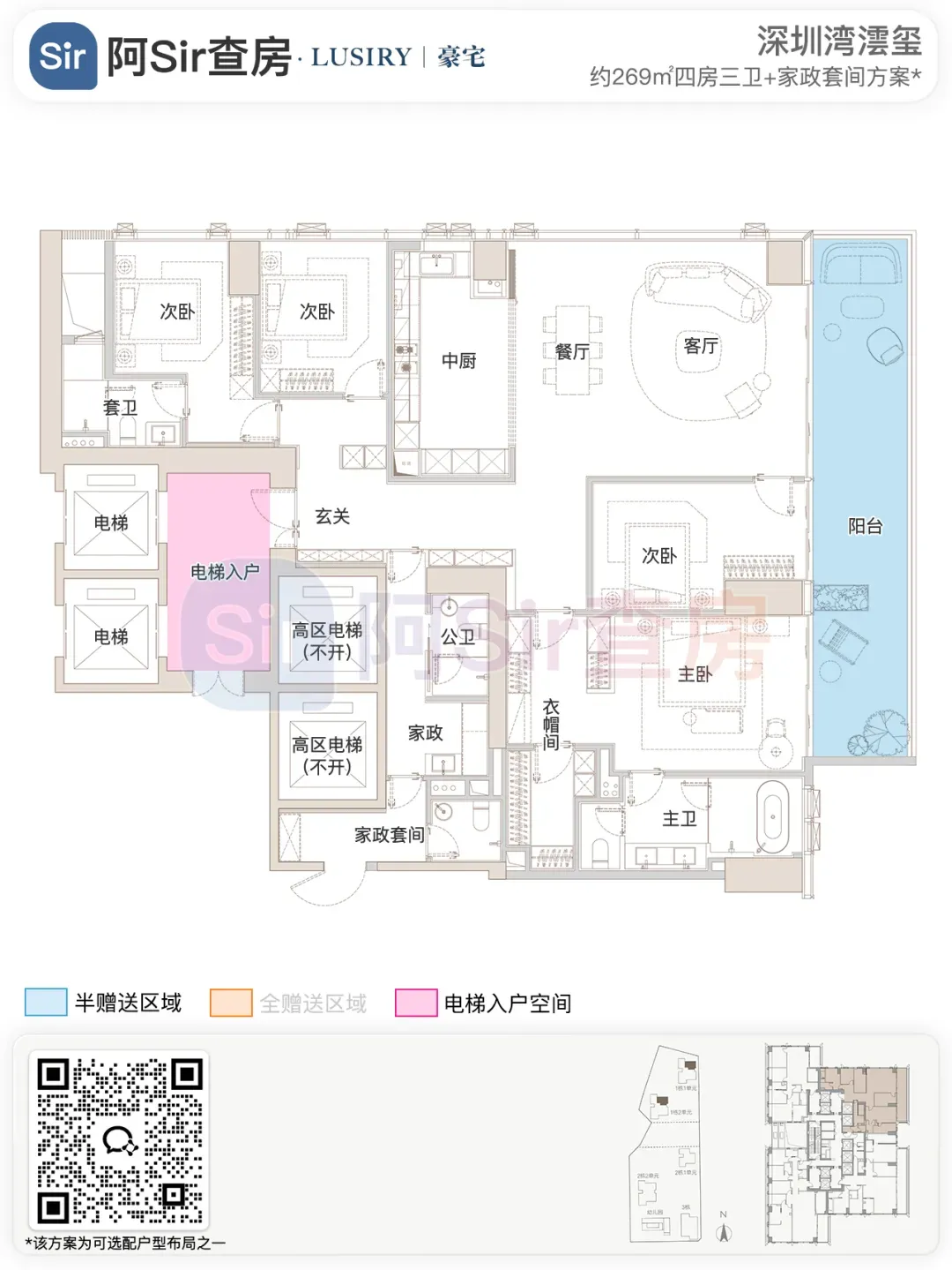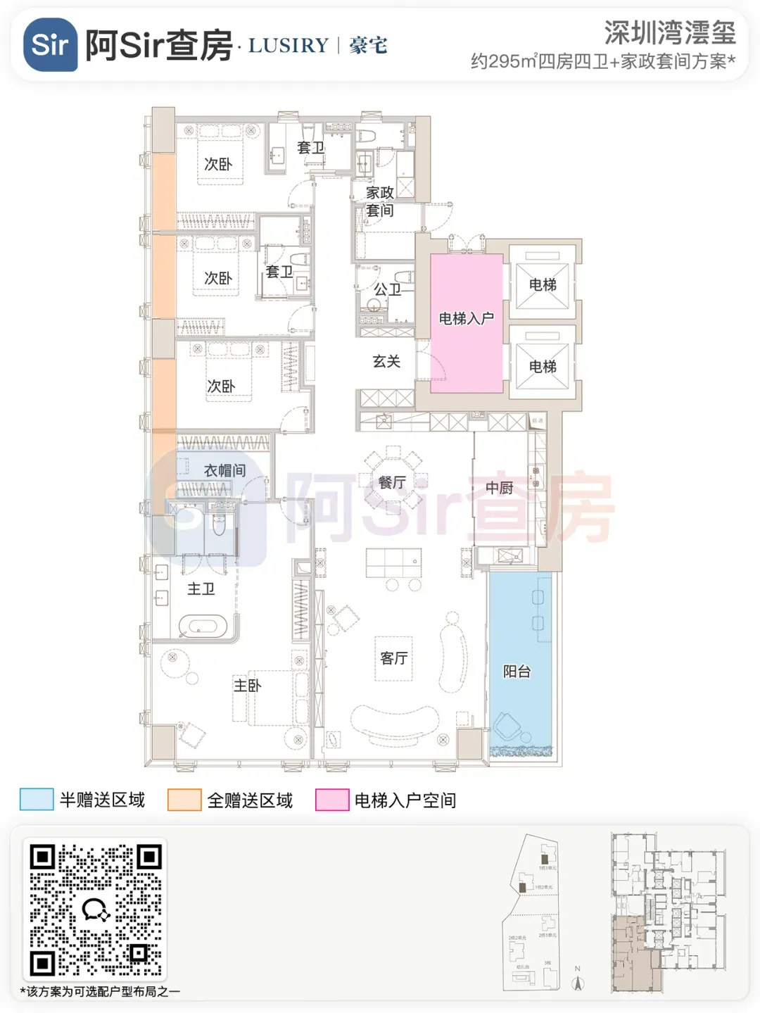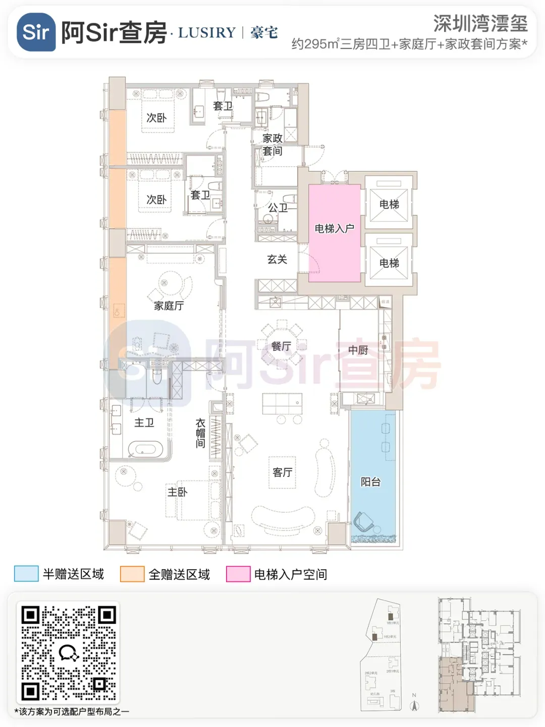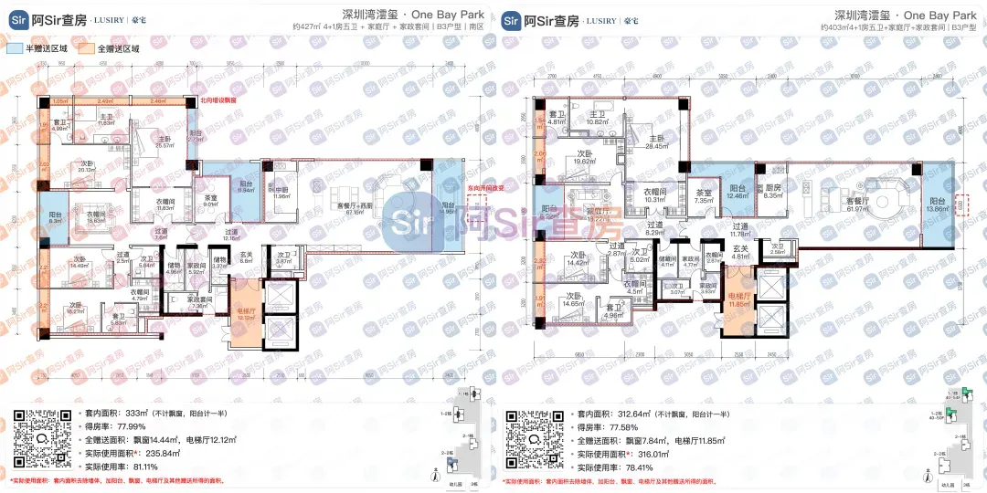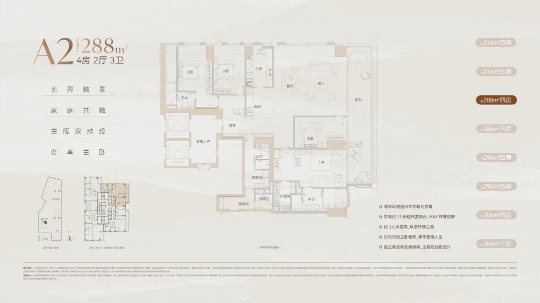 而位于1-1栋的北面距离「中海油大厦」比较近,在家里的北向落地窗都可以像《单身男女》一样,跟对面中海油小姐姐传情了。269㎡是209㎡的隔壁户,同样有两个方案可选,也是分为 三房三卫+家政套间 和 四房三卫+家政套间。最直观的区别也是把其中一个次卧改成了客厅,两个方案对比如下:- 269㎡三房三卫+家政套间方案把动区扩大串联超大阳台,光餐客厅有约65㎡,算上整个LDKB超过100㎡了。优点:整个动区超过100㎡,老实说Sir认为这个户型更应该做三房方案,太享受了,除了砍点实用性外没啥缺点。客厅动区空间穿插了一个次卧,可以满足大部分家庭的刚需居住空间。优点:实用性强,四个卧室基本上满足大部分家庭的刚需居住空间。不足:虽然增强了实用性,但玄关到客厅显得过道稍长,动线歪曲,不如三房户型来得开阔,且过道偏暗。阿Sir查房前期针对「深圳湾澐玺」组织了多次线下沙龙,当时不少老友们深度了解后纷纷考虑从209㎡加预算转投269㎡户型。主要考虑到该户型位于1-1栋的东面正对着街心公园,楼间距开阔,而1-2栋的东面对着小区园林,视野观感也非常舒服。对于景观和视野有执念的话,269㎡户型确实有更好的体验。另一个展示的样板间是295㎡户型,这个户型我现场细品了觉得尺度感不错,比单纯看户型图更能体现出来,整个室内空间非常之大,LDKB整体达到了90㎡左右。样板间展示的三房四卫+家庭厅+家政套间,另外还有一个可选方案就是正儿八经的四房四卫+家政套间,区别在于家庭厅的位置被拆分成了卧室和衣帽间。这个户型的功能设置和动线基本上可以满足二知三胎家庭的居住需求,不仅最大能够做到4+1房的功能,还有单独的家政套间,设计了主仆双动线。这里两个方案实质上都是可以有四个睡觉的空间,就不拆分来讲了。最大的优点是在中低区户型里实用性最强的,室内空间目测比305㎡还大。整个餐客厨的空间很开阔,阳台向东,客厅南向有5.8米的采光面,现场看这阳台并不小,毕竟有2.4米的深度,是个空间比例很好的阳台,好用。房间采光朝西,会有西晒,这方面虽然可以通过空调等高科技设备解决,不过西晒仍是不少人心中的隔阂,如果特别介意这个朝向则只能避开,去考虑269或305㎡的大面东向户型。另外有的老友说主卧门开在厅堂,呃,这个其实还好,毕竟主人家应该是在厅待到最晚的,而小孩住的次卧相对早睡,更应该远离动静大的客厅。如果次卧放到厅旁,晚上都不敢在客厅活动影响孩子休息。305㎡也没做样板间,同样有两个方案可选,也是分为 三房四卫+家庭厅+家政套间 和 四房四卫+家政套间,最直观的区别也是把其中一个次卧改成了客厅。两个方案对比如下:305㎡户型本质上是中低区里最动人的,即使它的阳台要花掉了两百多万,室内空间还没有295㎡大,动线稍微有点不完美,但坐落在东南角、空间分布均匀和全落地窗等还是让人无法太抗拒。老实说都305㎡还做三房的话,从理性角度看是不那么接受的,可能还没到那个level吧。而且动区如果想做大,把次卧敞开还不如把中厨敞开来得舒适。东南朝向,且两边都有园景,LDKB(餐客厨阳)空间有约86㎡,东向大阳台从客厅联通到主卧有近35㎡的阳台就离谱。还带有三个标准套间,卧室的空间分布均衡且好用。光看图没啥,后来对比后觉得比较遗憾的一个点客厅南侧开间只有5.1米,不如295㎡的5.8米南侧开间。如果想把动区做大,改中厨是最好的方式,但是中厨的灶台设在客厅墙边,如果改做半开放式中厨成本就会稍高,折腾。375㎡分两种户型,一个在东南户,一个在西南户,景观面都朝东看海。西南户大客厅独享东南向视野,与餐厅与起居厅共同组成了超尺度的大公区,并拥有西向的景观阳台。主卧室独享西南向转角位置,配以双向景观视野。